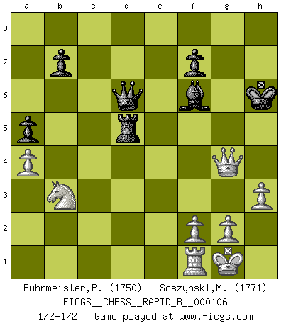 Last move : 1/2-1/2 2009 January 2 11:30:50 [Event "FICGS__CHESS__RAPID_B__000106"] [Site "FICGS"] [Date "2008.10.19"] [Round "1"] [White "Buhrmeister,Peter"] [Black "Soszynski,Marek"] [Result "1/2-1/2"] [WhiteElo "1750"] [BlackElo "1771"] 1.e4 c6 2.d4 d5 3.Nd2 g6 4.Bd3 Bg7 5.c3 Nh6 6.Ne2 O-O 7.O-O e5 8.exd5 cxd5 9.dxe5 Ng4 10.Nf3 Nc6 11.Bg5 Qa5 12.Ned4 Ngxe5 13.Nb3 Qc7 14.Re1 a5 15.a4 h6 16.Bh4 Bg4 17.Be2 Nc4 18.h3 Bxf3 19.Bxf3 N4e5 20.Bxd5 g5 21.Bg3 Rad8 22.c4 Rfe8 23.Qh5 Nb4 24.Bxe5 Rxe5 25.Rxe5 Bxe5 26.Qxh6 Nxd5 27.Qxg5+ Kf8 28.cxd5 Rxd5 29.Qh6+ Bg7 30.Qe3 Bxb2 31.Re1 Qd6 32.Qe8+ Kg7 33.Qe2 Bc3 34.Qg4+ Kh6 35.Rf1 Bf6 1/2-1/2 Caro-Kann : 3.Nd2 Kingside Castling by player Black (move 6) Kingside Castling by player White (move 7) This chess game ended in a draw. Follow this game move after move (download)Could we look into the head of a Chess player, we should see there a whole world of feelings, images, ideas, emotion and passion. (Alfred Binet) Der zweitbeste Zug ist oft der einzig richtige. (Savielly Grigorievitsch Tartakower) ¡Examina movidas que hagan daño! Un buen ojo for movidas desvastantes es mucho mas importante que el conocimiento de principios estratégicos. (Purdy) Un millionnaire : 'Monsieur Steinitz ! Vous ne participez aux tournois que pour l'argent, alors que moi je n'y viens que pour l'honneur.' Steinitz : 'Chacun joue pour ce qu'il n'a pas'... Perfection is achieved, not when there is nothing more to add, but when there is nothing left to take away. (Antoine de Saint-Exupéry)