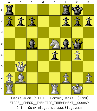 Last move : 0-1 2009 January 17 15:55:41 [Event "FICGS__CHESS__THEMATIC_TOURNAMENT__000062"] [Site "FICGS"] [Date "2008.10.20"] [Round "1"] [White "Buscia,Juan"] [Black "Parmet,Daniel"] [Result "0-1"] [WhiteElo "1800"] [BlackElo "1728"] 1.e4 e5 2.Nf3 Nc6 3.Bc4 Bc5 4.b4 Bxb4 5.c3 Be7 6.O-O Nf6 7.Re1 Nxe4 8.Bb3 d5 9.d4 exd4 10.cxd4 O-O 11.Nbd2 Bf5 12.Nxe4 dxe4 13.Ne5 Nxd4 14.Bb2 Bc5 15.g4 Nxb3 16.Qxb3 Qg5 0-1 Evans gambit : 5...Be7 Kingside Castling by player White (move 6) Kingside Castling by player Black (move 10) Player Black won this chess game. Follow this game move after move (download)No other master has such a terrific will to win. At the board he radiates danger, and even the strongest opponents tend to freeze, like rabbits when they smell a panther. Even his weaknesses are dangerous. As white, his opening game is predictable - you can make plans against it - but so strong that your plans almost never work. In the middle game his precision and invention are fabulous, and in the end game you simply cannot beat him. (Anonymous German Expert) Sitze auf Deine Hände. (Siegbert Tarrasch) El Ajedrez es parte de una cultura y si una cultura esta en decadencia, entonces también el Ajedrez declinará. (Mikhail Botvinnik) Les échecs sont un jeu terrible. Si vous n'avez pas le centre, votre adversaire a une position plus libre. Par contre, si vous avez le centre, alors vous avez vraiment quelque chose pour laquelle vous inquiéter ! (Siegbert Tarrasch) The modern world has divided itself into Conservatives and Progressives. The business of Progressives is to go on making mistakes. The business of the Conservatives is to prevent the mistakes from being corrected. (G.K. Chesterton)