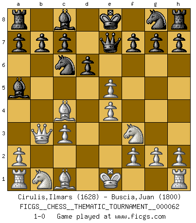 Last move : 1-0 2008 December 10 14:6:25 [Event "FICGS__CHESS__THEMATIC_TOURNAMENT__000062"] [Site "FICGS"] [Date "2008.10.20"] [Round "1"] [White "Cirulis,Ilmars"] [Black "Buscia,Juan"] [Result "1-0"] [WhiteElo "1628"] [BlackElo "1800"] 1.e4 e5 2.Nf3 Nc6 3.Bc4 Bc5 4.b4 Bxb4 5.c3 Ba5 6.Qb3 Qe7 7.d4 d6 8.dxe5 1-0 This chess game has been lost on time (started : 2008.10.20 5:56:41) Evans gambit Player White won this chess game. Follow this game move after move (download)We like to think. (Gary Kasparov) Schach ist das Spiel, das die Verrückten gesund hält. (Albert Einstein) En partidas rápidas, el Caballo es mas poderoso que el Alfil. (Vlastimil Hort) Le plus grand jeu de l'esprit jamais inventé, plus vous l'apprenez, plus vous y prenez du plaisir. (Garry Kasparov) Games, world of games... There's always an opponent, and there's always a victim. (Revolver, movie)