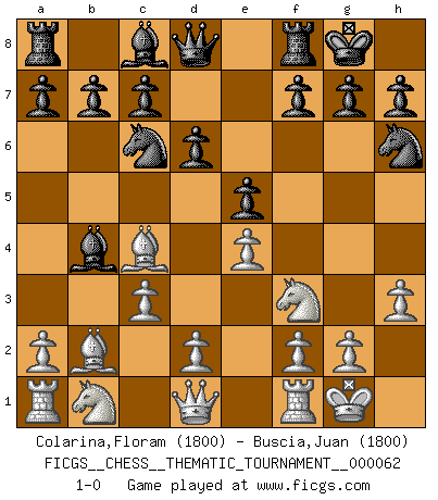 Last move : 1-0 2008 December 10 14:6:25 [Event "FICGS__CHESS__THEMATIC_TOURNAMENT__000062"] [Site "FICGS"] [Date "2008.10.20"] [Round "1"] [White "Colarina,Floram"] [Black "Buscia,Juan"] [Result "1-0"] [WhiteElo "1800"] [BlackElo "1800"] 1.e4 e5 2.Nf3 Nc6 3.Bc4 Bc5 4.b4 Bxb4 5.Bb2 d6 6.O-O Nh6 7.h3 O-O 8.c3 1-0 This chess game has been lost on time (started : 2008.10.20 5:56:41) Evans gambit Kingside Castling by player White (move 6) Kingside Castling by player Black (move 7) Player White won this chess game. Follow this game move after move (download)The game of chess is the touchstone of the intellect. (Goethe) Ich habe die besten Aussichten, den ersten Preis zu gewinnen - denn jeder muss gegen Steinitz spielen, nur ich nicht! (Wilhelm Steinitz) El estómago es una parte esencial del maestro de Ajedrez. (Bent Larsen) L'attaque fait le spectacle, la défense gagne les matchs. (Dicton footballistique) Always be a first-rate version of yourself, instead of a second-rate version of somebody else. (Judy Garland)