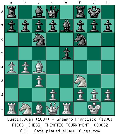 Last move : 0-1 2008 December 6 22:55:54 [Event "FICGS__CHESS__THEMATIC_TOURNAMENT__000062"] [Site "FICGS"] [Date "2008.10.20"] [Round "1"] [White "Buscia,Juan"] [Black "Gramajo,Francisco"] [Result "0-1"] [WhiteElo "1800"] [BlackElo "1206"] 1.e4 e5 2.Nf3 Nc6 3.Bc4 Bc5 4.b4 Be7 5.c3 Nf6 6.O-O O-O 7.a4 Nxe4 8.Re1 Nf6 0-1 This chess game has been lost on time (started : 2008.10.20 5:56:41) Evans gambit declined Kingside Castling by player White (move 6) Kingside Castling by player Black (move 6) Player Black won this chess game. Follow this game move after move (download)Chess is imagination. (David Bronstein) Fischer: 'Remis!?' Uhlmann: 'Aber es muss doch dreimal Zugwiederholung sein!' Fischer: 'Sie nehmen das Remis an, wie ich es sage, sonst spiele ich weiter und werde Sie dann schlagen!' (Robert James Fischer) Bobby Fischer es el mas grande genio de Ajedrez de todos los tiempos. (Alexander Kotov) Une platitude souvent récitée à propos des Echecs est qu'une des choses les plus difficiles à réaliser est de gagner une position gagnante. Cela ne manque pas de sens mais, pour ma part, j'ai toujours trouvé plus difficile de gagner une position perdante. (Tim Krabbe) Heh, heh, heh. Time to abandon ship. (General Grievous in Star Wars ep.3)