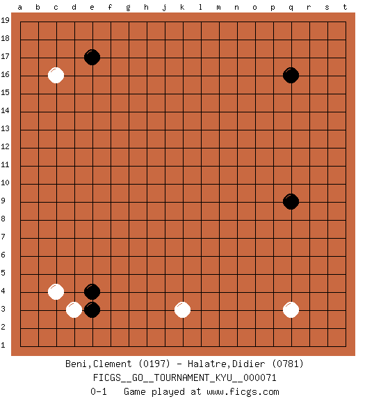 Last move : 0-1 2008 December 14 14:35:39 [Event "FICGS__GO__TOURNAMENT_KYU__000071 "] [Site "FICGS"] [Date "2008.10.20"] [Round "1"] [Black "Beni,Clement "] [White "Halatre,Didier "] [Result "0-1"] [Rating 1 "0197"] [Rating 2 "0781"] 1.q16 c16 2.e17 c4 3.e4 d3 4.e3 q3 5.q9 k3 0-1 This go game has been lost on time (started : 2008.10.20 6:58:47) Here are the names of the openings (joseki) played in the four corners : Corner d16 : c16 e17Komoku (Somok, Xiao~mu`) 3-4 Point. The komoku (3-4) point is the traditional corner enclosure move..Ikken Kakari (Hankan Keolch'im, Yi Gua`jiao~, 1-Space Low Pincer). The small knight move is the basic approach move to the 3-4 point stone. It has been continually used for over four centuries. There are limitless variations, with new moves constantly being discovered. Black 2 opens the door to a treaure store of joseki. Corner d4 : c4 e4Komoku (Somok, Xiao~mu`) 3-4 Point. The komoku (3-4) point is the traditional corner enclosure move..Ikken Takagakari (Hankan Nop'dakeolch'im, Yi Gaogua`jiao~, 1-Space High Approach). The 5-4 approach move has become more popular in modern times, as modern Go emphasizes speed and influence. Corner q4 : q3 q9Komoku (Somok, Xiao~mu`) 3-4 Point. The komoku (3-4) point is the traditional corner enclosure move.. Player White won this Go (weiqi, baduk) game.Follow this game move after move (download ) Everything would seem to be possible in Go. Like pulling a rabbit, by a magical move, out of a hat. (Pierre Audouard) Every man's memory is his private literature. (Aldous Huxley)