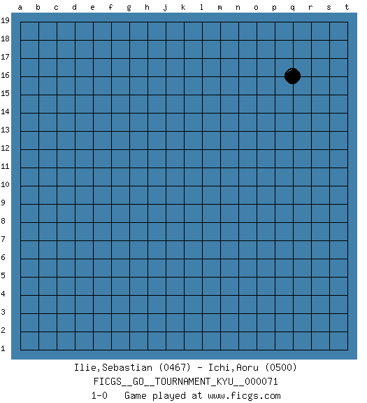 Last move : 1-0 2008 November 28 10:22:3 [Event "FICGS__GO__TOURNAMENT_KYU__000071"] [Site "FICGS"] [Date "2008.10.20"] [Round "1"] [Black "Ilie,Sebastian"] [White "Ichi,Aoru"] [Result "1-0"] [Rating 1 "0467"] [Rating 2 "0500"] 1.q16 1-0 This go game has been lost on time (started : 2008.10.20 6:58:47) Here are the names of the openings (joseki) played in the four corners : Player Black won this Go (weiqi, baduk) game. Follow this game move after move (download)Grab the border points between two moyos. (Anonymous) The real voyage of discovery consists not in seeking new lands but in seeing with new eyes. (Marcel Proust)