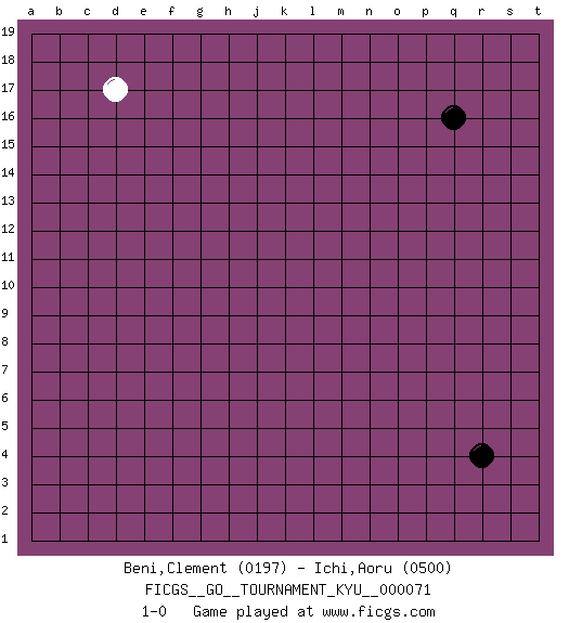 Last move : 1-0 2008 November 29 10:28:57 [Event "FICGS__GO__TOURNAMENT_KYU__000071"] [Site "FICGS"] [Date "2008.10.20"] [Round "1"] [Black "Beni,Clement"] [White "Ichi,Aoru"] [Result "1-0"] [Rating 1 "0197"] [Rating 2 "0500"] 1.q16 d17 2.r4 1-0 This go game has been lost on time (started : 2008.10.20 6:58:47) Here are the names of the openings (joseki) played in the four corners : Corner q4 : r4 1-0 Komoku (Somok, Xiao~mu`) 3-4 Point. The komoku (3-4) point is the traditional corner enclosure move.. Player Black won this Go (weiqi, baduk) game. Follow this game move after move (download)Josekis are not fixed, definitive things. They indicate the moments when everything can change. (Pierre Audouard) When it is a question of money, everybody is of the same religion. (Voltaire)
