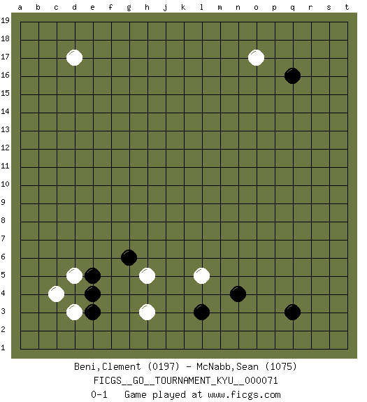 Last move : 0-1 2008 December 5 10:49:33 [Event "FICGS__GO__TOURNAMENT_KYU__000071 "] [Site "FICGS"] [Date "2008.10.20"] [Round "1"] [Black "Beni,Clement "] [White "McNabb,Sean "] [Result "0-1"] [Rating 1 "0197"] [Rating 2 "1075"] 1.q16 c4 2.q3 d17 3.e3 h3 4.l3 d3 5.e4 d5 6.e5 h5 7.g6 l5 8.n4 o17 0-1 This go game has been lost on time (started : 2008.10.20 6:58:47) Here are the names of the openings (joseki) played in the four corners : Corner d4 : c4 e3Komoku (Somok, Xiao~mu`) 3-4 Point. The komoku (3-4) point is the traditional corner enclosure move..Ikken Kakari (Hankan Keolch'im, Yi Gua`jiao~, 1-Space Low Pincer). The small knight move is the basic approach move to the 3-4 point stone. It has been continually used for over four centuries. There are limitless variations, with new moves constantly being discovered. Black 2 opens the door to a treaure store of joseki. Corner q16 : q16 o17Hoshi (Hwajeom, Seongjeom, Xingwei`) 4-4 Point. The star or hoshi (4-4) point, emphasizing influence at the potential expense of territory.Ikken Kakari (Hankan Keolch'im, Yi Gua`jiao~, 1-Space Low Approach). White 2 is the standard approach move to the 4-4. Player White won this Go (weiqi, baduk) game.Follow this game move after move (download ) Territory really exists only in the end. (Pierre Audouard) Wisdom doesn't necessarily come with age. Sometimes age just shows up all by itself. (Tom Watson)