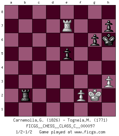 Last move : 1/2-1/2 2009 March 28 19:44:12 [Event "FICGS__CHESS__CLASS_C__000097"] [Site "FICGS"] [Date "2008.10.20"] [Round "1"] [White "Carnemolla,Giampaolo"] [Black "Tognela,Matteo"] [Result "1/2-1/2"] [WhiteElo "1826"] [BlackElo "1771"] 1.e4 d6 2.d4 Nf6 3.Nc3 g6 4.Nf3 Bg7 5.Bc4 O-O 6.h3 Nxe4 7.Nxe4 d5 8.Bd3 dxe4 9.Bxe4 c5 10.c3 cxd4 11.cxd4 Nc6 12.Bxc6 bxc6 13.O-O Be6 14.Be3 Rc8 15.Qd2 Bd5 16.Ne5 c5 17.Rfd1 Ba8 18.Rac1 Qd5 19.Nf3 cxd4 20.Bxd4 Rxc1 21.Rxc1 Bxd4 22.Qxd4 Qxa2 23.Ne5 Qd5 24.Qxd5 Bxd5 25.Rc7 f6 26.Rd7 Bxg2 27.Kxg2 fxe5 28.Rxe7 Rb8 29.Rxa7 Rxb2 30.Ra8+ Kg7 31.Ra7+ Kh6 32.Re7 1/2-1/2 Pirc : Classical (Two knights) system Kingside Castling by player Black (move 5) Kingside Castling by player White (move 13) 10 pieces endgame at move 29 : White KRPPP , Black KRPPP WHITE : King + 1 Rook 3 Pawns BLACK : King + 1 Rook 3 Pawns 9 pieces endgame at move 29 : White KRPP , Black KRPPP WHITE : King + 1 Rook 2 Pawns BLACK : King + 1 Rook 3 Pawns This chess game ended in a draw. Follow this game move after move (download)When you are lonely, when you feel yourself an alien in the world, play Chess. This will raise your spirits and be your counselor in war. (Aristotle) Fischer machte Schach einfach zu einer aufregenden Sache, wann immer er sich ans Brett setzte. (Raymond Keene) Cuando la partida de Ajedrez termina, el Peón y el Rey regresan a la misma caja. (Irish saying) Les Echecs, c'est l'art de la guerre sans les charniers, c'est la résurrection des morts tombés au champ d'honneur, l'espoir perpétuel, la suprématie de l'intelligence sur la force, la culture de l'esprit. (F. Szpiner) Games, world of games... There's always an opponent, and there's always a victim. (Revolver, movie)