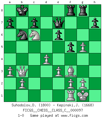 Last move : 1-0 2009 April 22 14:39:56 [Event "FICGS__CHESS__CLASS_C__000097"] [Site "FICGS"] [Date "2008.10.20"] [Round "1"] [White "Suhodolov,Dmitry"] [Black "Kepinski,Janusz"] [Result "1-0"] [WhiteElo "1800"] [BlackElo "1668"] 1.d4 d5 2.c4 Nc6 3.Nf3 Bg4 4.Nc3 e6 5.Bf4 Bd6 6.Bxd6 Qxd6 7.e3 dxc4 8.Bxc4 Nf6 9.h3 Bh5 10.O-O O-O-O 11.Be2 Kb8 12.a3 Nd5 13.Ne4 Qe7 14.Rc1 f5 15.Nc5 g5 16.Qb3 Nb6 17.Nxb7 Kxb7 18.Rxc6 Kxc6 19.Ne5+ Kb7 20.Bxh5 g4 21.hxg4 Rdf8 22.g5 Rhg8 23.Bf3+ Kb8 24.Nc6+ 1-0 QGD : Chigorin defense Kingside Castling by player White (move 10) Queenside Castling by player Black (move 10) Player White won this chess game. Follow this game move after move (download)Up to this point White has been following well-known analysis. But now he makes a fatal error: he begins to use his own head. (Siegbert Tarrasch) Ihnen, Herr Lasker, habe ich nur drei Worte zu sagen: Schach und matt. (Siegbert Tarrasch) Los errores estan ahí, esperando a que se cometan. (Savielly Tartakower) Vous savez, camarade Pachman, je n'éprouve pas de plaisir à être ministre, je jouerais plutôt aux échecs comme vous, ou alors ferais une révolution au Venezuela. (Che Guevara à Ludek Pachman, 'Checkmate in Prague', 1975) Art is the only way to run away without leaving home. (Twyla Tharp)