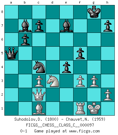 Last move : 0-1 2009 May 12 18:1:20 [Event "FICGS__CHESS__CLASS_C__000097"] [Site "FICGS"] [Date "2008.10.20"] [Round "1"] [White "Suhodolov,Dmitry"] [Black "Chauvet,Nicolas"] [Result "0-1"] [WhiteElo "1800"] [BlackElo "1959"] 1.d4 e6 2.c4 f5 3.g3 Nf6 4.Bg2 Be7 5.Nf3 O-O 6.O-O d6 7.Nc3 Ne4 8.Ne1 Nxc3 9.bxc3 Nc6 10.Rb1 Na5 11.Qa4 b6 12.Bxa8 Bd7 13.Qd1 Qxa8 14.c5 dxc5 15.dxc5 Rd8 16.Nd3 Qd5 17.cxb6 Bc6 18.f3 axb6 19.Bf4 Rd7 20.Qc2 g5 21.Bc1 g4 22.Nb4 Qc5+ 23.Kg2 Bb7 24.Bf4 Nc4 25.Rbd1 Rxd1 26.Qxd1 e5 27.Nd3 Qa5 28.Bc1 Qxa2 29.Kg1 gxf3 30.exf3 Qa5 31.Qc2 e4 0-1 Queen's pawn Kingside Castling by player Black (move 5) Kingside Castling by player White (move 6) Player Black won this chess game. Follow this game move after move (download)Could we look into the head of a Chess player, we should see there a whole world of feelings, images, ideas, emotion and passion. (Alfred Binet) Der zweitbeste Zug ist oft der einzig richtige. (Savielly Grigorievitsch Tartakower) Yo no creo en la psicología. Yo creo en las buenas movidas. (Bobby Fischer) La victoire dans une partie d'Echecs appartient la plupart du temps à celui qui voit un peu plus loin que l'adversaire. (Lasker) Patience, use the Force, think ! (Obi-Wan Kenobi in Star Wars ep.2)