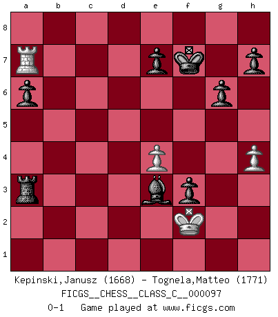 Last move : 0-1 2009 February 16 15:36:21 [Event "FICGS__CHESS__CLASS_C__000097"] [Site "FICGS"] [Date "2008.10.20"] [Round "1"] [White "Kepinski,Janusz"] [Black "Tognela,Matteo"] [Result "0-1"] [WhiteElo "1668"] [BlackElo "1771"] 1.d4 Nf6 2.c4 g6 3.e3 Bg7 4.Nf3 O-O 5.Be2 c5 6.Nc3 d5 7.O-O dxc4 8.Bxc4 cxd4 9.Nxd4 a6 10.a4 Qc7 11.Qe2 Nbd7 12.e4 Ng4 13.Nf3 Nde5 14.Nxe5 Nxe5 15.Ba2 Bg4 16.f3 Be6 17.Bxe6 fxe6 18.Be3 Qc4 19.Rfd1 Rfd8 20.Rac1 Kf7 21.Kf2 Nd3+ 22.Kg1 Rac8 23.Rd2 Nxb2 24.Rxd8 Qxe2 25.Nxe2 Rxd8 26.a5 Rd3 27.Bb6 Bh6 28.f4 e5 29.Rc7 Rd1+ 30.Kf2 Nd3+ 31.Kf3 exf4 32.Bd4 Rf1+ 33.Kg4 Nf2+ 34.Bxf2 Rxf2 35.Nd4 Rxg2+ 36.Kh3 Rb2 37.Nf3 Rb5 38.Kg4 Rxa5 39.Rxb7 Ra2 40.h4 Rg2+ 41.Kh3 Rg3+ 42.Kh2 Rxf3 43.Ra7 Ra3 44.Kg2 f3+ 45.Kf2 Be3+ 0-1 King's Indian defense Kingside Castling by player Black (move 4) Kingside Castling by player White (move 7) Player Black won this chess game. Follow this game move after move (download)Chess is no whit inferior to the violin, and we have a large number of professional violinists. (Mikhail Botvinnik) Wenn Du einsam bist, wenn Du Dich in der Welt wie ein Fremder fühlst, spiele Schach. Das wird Deinen Geist erheben und Dein Ratgeber im Kampf sein. (Aristoteles) Debemos de asegurarnos de que el Ajedrez no se convierta en un lenguaje muerto, muy interesante, pero tan solo para un grupo muy pequeño. (Sytze Faber) La conception d'un plan est le processus par lequel un joueur exploite les avantages de sa position tout en s'efforçant d'en réduire au minimum les inconvénients. Afin de garantir le succès, un plan doit toujours se fonder sur un diagnostic objectif des particularités d'une position. La conception d'un plan est d'autant plus difficile que la position est équilibrée, et grandement facilitée lorsqu'il n'existe qu'un seul plan susceptible de répondre aux exigences de la position. (Harry Golombek) If you have any trouble condescending, find a Unix user to show you how it's done. (Scott Adams)