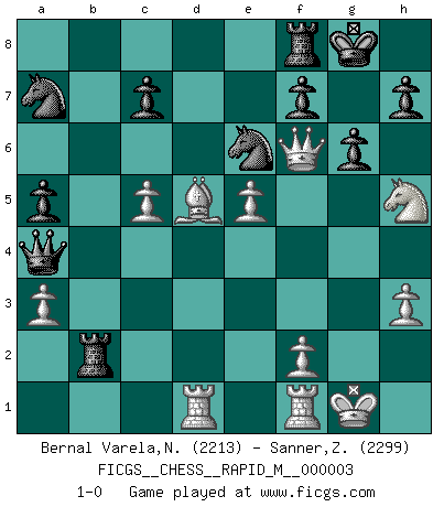 Last move : 1-0 2006 September 26 8:29:52 [Event "FICGS__CHESS__RAPID_M__000003"] [Site "FICGS"] [Date "2006.08.14"] [Round "1"] [White "Bernal Varela,Nelson"] [Black "Sanner,Zdzislaw"] [Result "1-0"] [WhiteElo "2213"] [BlackElo "2299"] 1.e4 Nf6 2.e5 Nd5 3.d4 d6 4.Nf3 Bg4 5.Be2 e6 6.O-O Be7 7.c4 Nb6 8.Nc3 O-O 9.Be3 d5 10.c5 Bxf3 11.gxf3 Nc8 12.f4 Nc6 13.f5 exf5 14.Bf3 Bg5 15.Nxd5 f4 16.Bxf4 Bxf4 17.Nxf4 Nxd4 18.Bxb7 Rb8 19.Bg2 Rxb2 20.Qg4 Qe8 21.Rad1 Qa4 22.h3 a5 23.a3 Na7 24.Be4 Kh8 25.Nh5 Ne6 26.Qf5 g6 27.Qf6+ Kg8 28.Bd5 1-0 Alekhine's defense : Modern variation, 4...Bg4 Kingside Castling by player White (move 6) Kingside Castling by player Black (move 8) Player White won this chess game. Follow this game move after move (download)Chess is like life. (Boris Spassky) Ich organisiere ein großes Turnier, was mich etwa 120000 Dollar kostet. Ich denke, das ist das erste Mal in der Schachgeschichte, daß ein Schachgroßmeister auch als Mäzen auftritt. (Miguel Najdorf) ¡Examina movidas que hagan daño! Un buen ojo for movidas desvastantes es mucho mas importante que el conocimiento de principios estratégicos. (Purdy) La tactique, c'est ce que vous faites quand il y a quelque chose à faire; la stratégie, c'est ce que vous faites quand il n'y a rien à faire. (Savielli Tartacower) Thibault, I ask for draw. Game 13876. - Sorry Ilmars, you won. (FICGS chat)