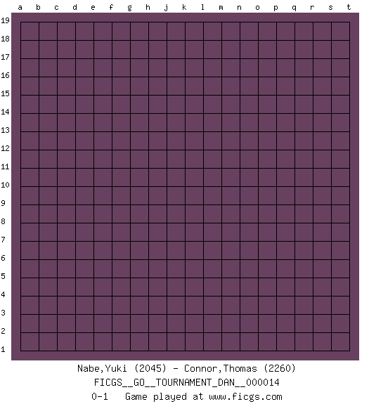 Last move : 0-1 2008 November 26 22:0:52 [Event "FICGS__GO__TOURNAMENT_DAN__000014"] [Site "FICGS"] [Date "2008.10.20"] [Round "1"] [Black "Nabe,Yuki"] [White "Connor,Thomas"] [Result "0-1"] [Rating 1 "2045"] [Rating 2 "2260"] 0-1 This go game has been lost on time (started : 2008.10.20 17:2:5) Here are the names of the openings (joseki) played in the four corners : Player White won this Go (weiqi, baduk) game. Follow this game move after move (download)Grab the border points between two moyos. (Anonymous) There are more things in heaven and earth than practically anywhere else. (Unknown)