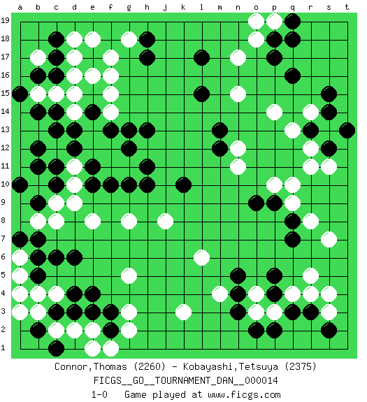Last move : 1-0 2009 April 16 2:52:26 [Event "FICGS__GO__TOURNAMENT_DAN__000014"] [Site "FICGS"] [Date "2008.10.20"] [Round "1"] [Black "Connor,Thomas"] [White "Kobayashi,Tetsuya"] [Result "1-0"] [Rating 1 "2260"] [Rating 2 "2375"] 1.q16 d16 2.q3 c4 3.e4 r5 4.q7 q4 5.r3 p3 6.p4 s3 7.p5 r4 8.p2 o3 9.s2 s4 10.o2 s7 11.n3 o4 12.n5 r8 13.d6 g3 14.e3 k3 15.c14 c12 16.e14 f16 17.c10 c15 18.b14 c8 19.c6 b10 20.b9 c9 21.b11 d10 22.c11 d11 23.b12 b8 24.a10 e8 25.h17 f17 26.l17 r14 27.s15 n17 28.p17 n15 29.l15 p14 30.q8 q9 31.p9 q10 32.s14 s13 33.b16 b15 34.a15 b17 35.c16 d15 36.c17 d17 37.c18 d14 38.d12 e12 39.d13 e13 40.c13 f14 41.e11 f11 42.f2 g2 43.e10 d9 44.f10 g11 45.g10 g8 46.h11 f12 47.h10 j8 48.k10 a5 49.b5 a6 50.a4 b4 51.a7 a3 52.b6 a4 53.b7 d2 54.b2 e2 55.f3 f1 56.d3 c2 57.c3 b3 58.c1 e1 59.d4 g5 60.h13 p10 61.o9 m4 62.n4 l6 63.g13 g18 64.h18 d18 65.e15 f15 66.f13 e16 67.e14 e18 68.r13 q13 69.s12 r12 70.t13 s11 71.r13 r11 72.g12 o18 73.p18 p19 74.q19 o19 75.q18 n11 76.m12 n12 77.m13 1-0 This go game has been lost on time (started : 2008.10.20 17:2:5) Here are the names of the openings (joseki) played in the four corners : Corner d4 : c4 e4 Komoku (Somok, Xiao~mu`) 3-4 Point. The komoku (3-4) point is the traditional corner enclosure move.. Ikken Takagakari (Hankan Nop'dakeolch'im, Yi Gaogua`jiao~, 1-Space High Approach). The 5-4 approach move has become more popular in modern times, as modern Go emphasizes speed and influence. Corner q4 : q3 r5 Komoku (Somok, Xiao~mu`) 3-4 Point. The komoku (3-4) point is the traditional corner enclosure move.. Ikken Kakari (Hankan Keolch'im, Yi Gua`jiao~, 1-Space Low Pincer). The small knight move is the basic approach move to the 3-4 point stone. It has been continually used for over four centuries. There are limitless variations, with new moves constantly being discovered. White 2 opens the door to a treaure store of joseki. Corner d16 : d16 c14 Hoshi (Hwajeom, Seongjeom, Xingwei`) 4-4 Point. The star or hoshi (4-4) point, emphasizing influence at the potential expense of territory. Ikken Kakari (Hankan Keolch'im, Yi Gua`jiao~, 1-Space Low Approach). Black 2 is the standard approach move to the 4-4. Player Black won this Go (weiqi, baduk) game. Follow this game move after move (download)Use a wall to attack, not to make territory. (Anonymous) Mac users swear by their computers. PC users swear at their computers. (Author unknown)