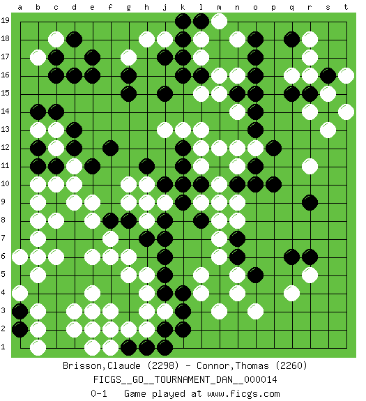 Last move : 0-1 2009 February 1 22:46:38 [Event "FICGS__GO__TOURNAMENT_DAN__000014"] [Site "FICGS"] [Date "2008.10.20"] [Round "1"] [Black "Brisson,Claude"] [White "Connor,Thomas"] [Result "0-1"] [Rating 1 "2298"] [Rating 2 "2260"] 1.d4 q16 2.c16 q4 3.o17 r14 4.j17 c10 5.c7 c13 6.k4 d3 7.c3 e3 8.c2 e4 9.d5 h3 10.r9 r11 11.r6 r5 12.q6 o3 13.q18 r17 14.e16 l17 15.o15 l15 16.j15 l13 17.o13 j13 18.j2 m3 19.j5 g5 20.h7 f7 21.f8 e8 22.e7 f6 23.d8 e9 24.g8 e6 25.d7 j3 26.k3 h2 27.k2 h5 28.j6 d2 29.g15 n14 30.o14 n16 31.o16 r18 32.p10 g17 33.g16 d17 34.d16 j18 35.k18 h18 36.k17 c18 37.f12 b17 38.b14 b13 39.c14 b8 40.c9 b9 41.b11 d9 42.c11 d11 43.d12 c12 44.e11 d10 45.d13 b6 46.b4 b5 47.c5 b10 48.b12 b7 49.a2 b1 50.c1 a4 51.k11 l11 52.k12 l12 53.l10 m10 54.k10 n11 55.o11 m8 56.n7 m7 57.n6 m6 58.m5 n8 59.l16 m16 60.k16 n12 61.n10 n9 62.o10 n5 63.o5 k13 64.m11 n18 65.o18 l18 66.l19 l9 67.m9 o12 68.p12 m10 69.a3 b2 70.m9 m19 71.k19 m10 72.e5 m12 73.f5 g6 74.n15 j9 75.h11 l5 76.f4 f3 77.g4 h4 78.g3 g2 79.f2 f1 80.d1 e2 81.a5 e1 82.h1 c6 83.d6 c8 84.c4 a6 85.j1 a4 86.m4 l4 87.a5 n4 88.g1 f2 89.j4 a4 90.q15 b3 91.r15 g10 92.h9 s15 93.s16 s13 94.t15 t14 95.s14 h10 96.j10 g9 97.k9 s15 98.e17 t16 99.d18 h8 100.j8 h9 101.l8 m9 102.j7 r16 103.c17 m15 0-1 Here are the names of the openings (joseki) played in the four corners : Corner q16 : q16 o17 Hoshi (Hwajeom, Seongjeom, Xingwei`) 4-4 Point. The star or hoshi (4-4) point, emphasizing influence at the potential expense of territory. Ikken Kakari (Hankan Keolch'im, Yi Gua`jiao~, 1-Space Low Approach). Black 2 is the standard approach move to the 4-4. Corner q4 : q4 r9 Hoshi (Hwajeom, Seongjeom, Xingwei`) 4-4 Point. The star or hoshi (4-4) point, emphasizing influence at the potential expense of territory. Player White won this Go (weiqi, baduk) game. Follow this game move after move (download)In the opening, when you don't know what to play, make a shimari. (Jansteen) I live to kill Traxler counterattack. (Ilmars Cirulis)