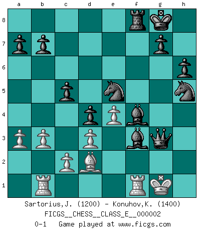 Last move : 0-1 2006 May 8 19:34:28 [Event "FICGS__CHESS__CLASS_E__000002"] [Site "FICGS"] [Date "2006.04.15"] [Round "1"] [White "Sartorius,Julien"] [Black "Konuhov,Konstantin"] [Result "0-1"] [WhiteElo "1200"] [BlackElo "1400"] 1.e4 c5 2.Nf3 Nc6 3.Nc3 Nf6 4.Bc4 e6 5.d3 d5 6.Bb3 d4 7.Nb5 Qa5+ 8.Bd2 Qxb5 9.O-O Bd6 10.a3 O-O 11.g3 e5 12.Bc4 Qb6 13.b3 Bg4 14.h3 Bxh3 15.Re1 Bc7 16.Ng5 Bg4 17.f3 Bd7 18.Rf1 h6 19.Nxf7 Rxf7 20.Bxf7+ Kxf7 21.Ra2 Be6 22.f4 Bg4 23.Qc1 Nh5 24.Qe1 Kg8 25.Rb2 Rf8 26.Qf2 exf4 27.gxf4 Bxf4 28.R2b1 Ne5 29.Kg2 Bf3+ 30.Kg1 Qg6+ 31.Qg3 Qxg3+ 0-1 Sicilian defense Kingside Castling by player White (move 9) Kingside Castling by player Black (move 10) Player Black won this chess game. Follow this game move after move (download)Human affairs are like a Chess game: only those who do not take it seriously can be called good players. (Hung Tzu Ch'eng) Kombinieren und Schwarzhandel gehören verboten. (Savielly Grigorievitsch Tartakower) El tablero es el mundo, las piezas es el fenomeno del universo, las reglas del juego son lo que llamamos leyes de la naturaleza y el jugador del lado opuesto, se encuentra oculto a nuestra vista. (Thomas Huxley) La tactique est l'élément le plus important du milieu de jeu. (Siegbert Tarrasch) A bird doesn't sing because it has an answer, it sings because it has a song. (Maya Angelou)