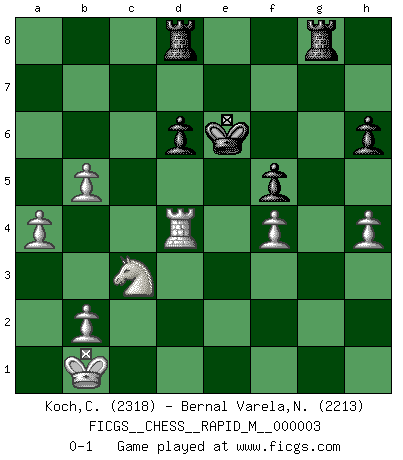 Last move : 0-1 2006 December 5 23:59:34 [Event "FICGS__CHESS__RAPID_M__000003"] [Site "FICGS"] [Date "2006.08.14"] [Round "1"] [White "Koch,Christian"] [Black "Bernal Varela,Nelson"] [Result "0-1"] [WhiteElo "2318"] [BlackElo "2213"] 1.e4 c5 2.Nf3 d6 3.d4 cxd4 4.Nxd4 Nf6 5.Nc3 a6 6.Be2 e5 7.Nb3 Be7 8.Be3 O-O 9.g4 Be6 10.g5 Nfd7 11.Rg1 a5 12.Bb5 Nc6 13.Qe2 a4 14.Nxa4 Nd4 15.Bxd4 exd4 16.O-O-O Nc5 17.Rxd4 Nxb3+ 18.cxb3 Bxg5+ 19.Kb1 Bf4 20.Rg2 Kh8 21.Rd1 Qa5 22.Bc4 b5 23.Bxb5 Rfc8 24.h4 h6 25.Rdg1 Rab8 26.Bd3 g6 27.Qf3 Qd2 28.Qd1 Qa5 29.Bc2 Bh3 30.Rg3 Bxg3 31.Rxg3 Be6 32.f4 Rg8 33.Qd4+ Kh7 34.Nc3 Qh5 35.Qf6 Qa5 36.Rd3 Qd8 37.Qxd8 Rbxd8 38.a4 f5 39.Rd4 fxe4 40.Rxe4 Bf5 41.Rd4 Kg7 42.Bxf5 gxf5 43.b4 Kf6 44.b5 Ke6 0-1 Sicilian : Najdorf, Opovcensky variation Kingside Castling by player Black (move 8) Queenside Castling by player White (move 16) Player Black won this chess game. Follow this game move after move (download)When you don't know what to play, wait for an idea to come into your opponent's mind. You may be sure that idea will be wrong. (Siegbert Tarrasch) Der Verteidiger gebe der Gewalt nach, aber nur der Gewalt. Er schaffe sich nicht freiwillig, etwa aus Blindheit oder aus Schrecken, irgendwelche Schwächen. Er lasse sich nicht bluffen. (Emanuel Lasker) Hasta este punto, las blancas han seguido un análisis bien conocido. Pero ahora el hace un error fatal: empieza a usar su propia cabeza. (Siegbert Tarrasch) Le pion, dans sa simplicité, marche droit devant lui, mais lorsqu'il prend, il le fait obliquement? Ainsi l'homme, tant qu'il reste pauvre, marche dans la droiture et vit honnêtement, mais lorsqu'il recherche les honneurs, il flatte, se parjure et, par les voies obliques, cherche une position supérieure sur l'échiquier du monde. (Jean de Galles) The difference between perseverance and obstinacy is that one comes from a strong will, and the other from a strong won't. (Henry Ward Beecher)