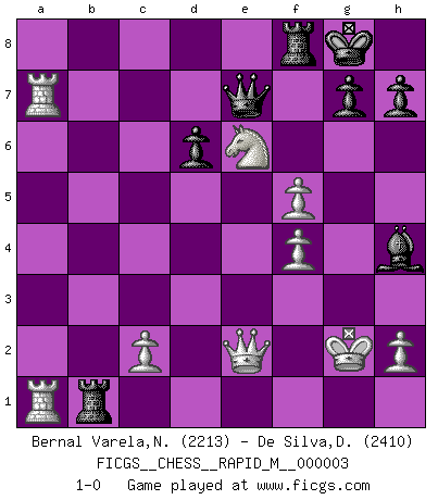 Last move : 1-0 2006 November 4 18:22:59 [Event "FICGS__CHESS__RAPID_M__000003"] [Site "FICGS"] [Date "2006.08.14"] [Round "1"] [White "Bernal Varela,Nelson"] [Black "De Silva,Dinesh"] [Result "1-0"] [WhiteElo "2213"] [BlackElo "2410"] 1.e4 c5 2.Nf3 d6 3.d4 cxd4 4.Nxd4 Nf6 5.Nc3 a6 6.Be3 e6 7.f3 b5 8.g4 Nfd7 9.Qd2 Nb6 10.a4 bxa4 11.Nxa4 Nxa4 12.Rxa4 Be7 13.Be2 O-O 14.O-O Bb7 15.Rfa1 Nd7 16.Nb3 Rb8 17.Bxa6 Bxa6 18.Rxa6 Ne5 19.Qe2 f5 20.gxf5 exf5 21.f4 Ng6 22.Nd4 Rxb2 23.exf5 Nh4 24.Bf2 Bf6 25.Ne6 Qe7 26.Bxh4 Bxh4 27.Ra7 Rb1+ 28.Kg2 1-0 Sicilian : Najdorf, Byrne (English) attack Kingside Castling by player Black (move 13) Kingside Castling by player White (move 14) Player White won this chess game. Follow this game move after move (download)The defensive power of a pinned piece is only imaginary. (Aaron Nimzovich) Es ist nicht das erste mal, dass sich die FIDE dem Arabischen Geld gebeugt hat (über die FIDE WM 2004 in Lybien). (Larry Evans) Cuando no sepas que mover, espera por una idea que se le venga a la la cabeza de tu oponente. Tenlo por seguro de que esa idea estará incorrecta. (Siegbert Tarrasch) Ce qui caractérise les parties de combat, c'est que si le défenseur a constamment de difficiles problèmes à résoudre, l'attaquant doit chercher sans relâche de nouvelles possibilités d'attaque. (Koblentz) I've lost money so fast in these clubs it's left me reeling. I've read every poker book ever written, but the only way to get better at the game is to go out and play with people who are really good. The problem is, you stand to lose a lot of money doing it. (Matt Damon)
