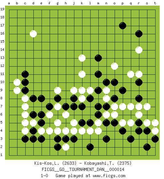 Last move : 1-0 2009 February 9 7:50:16 [Event "FICGS__GO__TOURNAMENT_DAN__000014"] [Site "FICGS"] [Date "2008.10.20"] [Round "1"] [Black "Kis-Kos,Laszlo"] [White "Kobayashi,Tetsuya"] [Result "1-0"] [Rating 1 "2633"] [Rating 2 "2375"] 1.r16 d16 2.q3 c4 3.p17 q5 4.r5 r6 5.r4 q7 6.p4 r11 7.e3 r14 8.d6 e4 9.d4 d5 10.d3 c5 11.e5 f4 12.c3 c6 13.e6 c8 14.g2 h4 15.e8 j5 16.c9 b9 17.d8 c7 18.c10 b10 19.c11 h2 20.g3 g4 21.r8 s7 22.r10 q11 23.p9 n9 24.o8 o6 25.m7 n8 26.n7 o7 27.o10 o12 28.n10 l9 29.n5 n6 30.m6 m5 31.l5 m4 32.o5 l4 33.k7 k8 34.j7 s5 35.m11 k11 36.m13 k13 37.s4 t4 38.t3 t5 39.s2 p5 40.n3 p7 41.k5 k4 42.l2 g7 43.j8 j9 44.l8 k9 45.m9 r7 46.j3 j4 47.h3 g9 48.g6 h6 49.h7 f6 50.f7 g5 51.g8 1-0 Here are the names of the openings (joseki) played in the four corners : Corner q4 : q3 q5 Komoku (Somok, Xiao~mu`) 3-4 Point. The komoku (3-4) point is the traditional corner enclosure move.. Ikken Takagakari (Hankan Nop'dakeolch'im, Yi Gaogua`jiao~, 1-Space High Approach). The 5-4 approach move has become more popular in modern times, as modern Go emphasizes speed and influence. Corner d4 : c4 e3 Komoku (Somok, Xiao~mu`) 3-4 Point. The komoku (3-4) point is the traditional corner enclosure move.. Ikken Kakari (Hankan Keolch'im, Yi Gua`jiao~, 1-Space Low Pincer). The small knight move is the basic approach move to the 3-4 point stone. It has been continually used for over four centuries. There are limitless variations, with new moves constantly being discovered. Black 2 opens the door to a treaure store of joseki. Corner d16 : d16 c11 Hoshi (Hwajeom, Seongjeom, Xingwei`) 4-4 Point. The star or hoshi (4-4) point, emphasizing influence at the potential expense of territory. Player Black won this Go (weiqi, baduk) game. Follow this game move after move (download)The comb formation is alive. (Anonymous) In theory there is no difference between theory and practice. In practice there is. (Yogi Berra)