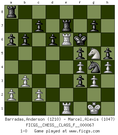 Last move : 1-0 2008 October 30 16:46:44 [Event "FICGS__CHESS__CLASS_F__000067"] [Site "FICGS"] [Date "2008.10.22"] [Round "1"] [White "Barradas,Anderson"] [Black "Marcel,Alexis"] [Result "1-0"] [WhiteElo "1210"] [BlackElo "1047"] 1.d4 f5 2.Nc3 Nf6 3.Bg5 e6 4.Nf3 Be7 5.e3 O-O 6.Be2 b6 7.O-O Bb7 8.Rb1 h6 9.Bxf6 Bxf6 10.Ne5 Bxe5 11.dxe5 Qg5 12.Bf3 Bxf3 13.Qxf3 Nc6 14.Rbd1 Nxe5 15.Qf4 d6 16.h4 Qxf4 17.exf4 Ng4 18.g3 h5 19.Nb5 Rfc8 20.Rfe1 Kf7 21.Nd4 Re8 22.b3 a6 23.Nf3 Kf6 24.Rd2 Re7 25.Ng5 e5 26.Rde2 e4 27.f3 exf3 28.Re6+ 1-0 Dutch Kingside Castling by player Black (move 5) Kingside Castling by player White (move 7) Player White won this chess game. Follow this game move after move (download)Chess, like love, is infectious at any age. (Flohr) Ja, jede Frau in Holland liebt mich bestimmt, und alle Männer hassen mich. (Loek van Wely) Solo existe una cosa que Fischer hace en el Ajedrez sin placer: ¡perder!. (Boris Spassky) Les échecs sont plus proches de l'art de l'assassinat que de l'art de la guerre. (Arturo Perez-Reverte) Whatever you do, don't be bored. This is absolutely the most exciting time we could have possibly hoped to be alive. And things are just starting. (From movie Waking life)