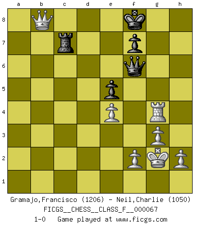 Last move : 1-0 2008 November 23 2:22:38 [Event "FICGS__CHESS__CLASS_F__000067"] [Site "FICGS"] [Date "2008.10.22"] [Round "1"] [White "Gramajo,Francisco"] [Black "Neil,Charlie"] [Result "1-0"] [WhiteElo "1206"] [BlackElo "1050"] 1.e4 e5 2.Bb5 c6 3.Bc4 Nf6 4.d3 Bc5 5.Nf3 Qe7 6.Bg5 O-O 7.c3 h6 8.Bh4 d6 9.b4 Nbd7 10.bxc5 dxc5 11.Nbd2 b5 12.Bb3 Re8 13.c4 b4 14.O-O Nf8 15.a3 Ng6 16.Bxf6 Qxf6 17.a4 a5 18.Qe2 Nf4 19.Qe3 Be6 20.Qxc5 Nxd3 21.Qxc6 Nf4 22.c5 Qg6 23.g3 Nh3+ 24.Kg2 Nf4+ 25.Kh1 Rac8 26.Qb6 Ne2 27.Nh4 Qh5 28.Bxe6 Rxe6 29.Qxa5 R8c6 30.Qxb4 g5 31.Ng2 g4 32.a5 Nd4 33.Ra2 Qg5 34.Nh4 Qe7 35.Nf5 Nxf5 36.Rc1 Nd4 37.Nb3 Nxb3 38.Qxb3 Rxc5 39.a6 Rxc1+ 40.Kg2 Rxa6 41.Rxa6 Rc7 42.Rxh6 Kg7 43.Rh4 Qf6 44.Rxg4+ Kf8 45.Qb8+ 1-0 King's pawn game Kingside Castling by player Black (move 6) Kingside Castling by player White (move 14) Player White won this chess game. Follow this game move after move (download)No other master has such a terrific will to win. At the board he radiates danger, and even the strongest opponents tend to freeze, like rabbits when they smell a panther. Even his weaknesses are dangerous. As white, his opening game is predictable - you can make plans against it - but so strong that your plans almost never work. In the middle game his precision and invention are fabulous, and in the end game you simply cannot beat him. (Anonymous German Expert) Sitze auf Deine Hände. (Siegbert Tarrasch) Después de la respuesta de las negras a 1.e4 con 1..e5, se quedan siempre tratando de entrar dentro del juego. (Howard Staunton) Le succès, c'est être capable d'aller d'échec en échec sans perdre son enthousiasme. (Winston Churchill) The problem with manipulation is that people can turn on you. (Horatio Caine, C.S.I. Miami)