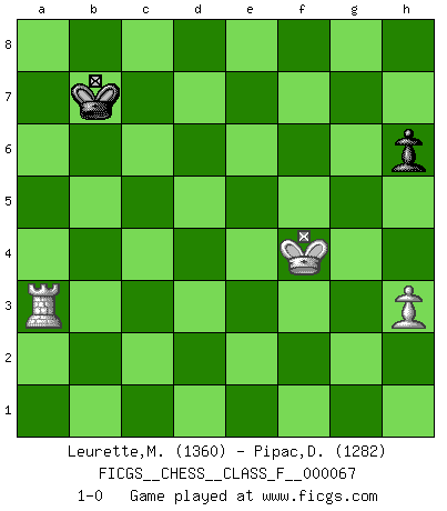 Last move : 1-0 2008 November 17 17:24:2 [Event "FICGS__CHESS__CLASS_F__000067"] [Site "FICGS"] [Date "2008.10.22"] [Round "1"] [White "Leurette,Marc-Antoine"] [Black "Pipac,Darko"] [Result "1-0"] [WhiteElo "1360"] [BlackElo "1282"] 1.e4 e5 2.Nf3 Nc6 3.Bc4 Bc5 4.b4 Bxb4 5.c3 Bc5 6.d4 exd4 7.cxd4 Bb6 8.O-O h6 9.Nc3 d6 10.Be3 Bg4 11.Bb5 Nge7 12.Nd5 Nxd5 13.exd5 Qd7 14.Rc1 O-O 15.dxc6 Qe6 16.cxb7 Rab8 17.Ba6 Bxf3 18.Qxf3 Qxa2 19.Ra1 Qb3 20.d5 Bxe3 21.fxe3 f6 22.e4 Qb4 23.Rfb1 Qd4+ 24.Kh1 Rfe8 25.Rd1 Qxe4 26.Qxe4 Rxe4 27.Re1 Rd4 28.Red1 Re4 29.Rab1 Kf7 30.Bd3 Re5 31.Bc4 Ke7 32.h3 Kd7 33.Kh2 c6 34.dxc6+ Kxc6 35.Rdc1 Rc5 36.Ba6 d5 37.Rxc5+ Kxc5 38.g4 d4 39.Kg2 g6 40.Rc1+ Kb6 41.Rc8 Kxa6 42.Rxb8 Kb6 43.Kf3 a5 44.Ke4 f5+ 45.gxf5 gxf5+ 46.Kxd4 f4 47.Ke4 a4 48.Kxf4 a3 49.Ra8 Kxb7 50.Rxa3 1-0 Evans gambit Kingside Castling by player White (move 8) Kingside Castling by player Black (move 14) 10 pieces endgame at move 45 : White KRPPP , Black KPPPP WHITE : King + 1 Rook 3 Pawns BLACK : King + 4 Pawns 9 pieces endgame at move 45 : White KRPP , Black KPPPP WHITE : King + 1 Rook 2 Pawns BLACK : King + 4 Pawns 8 pieces endgame at move 46 : White KRPP , Black KPPP WHITE : King + 1 Rook 2 Pawns BLACK : King + 3 Pawns 7 pieces endgame at move 48 : White KRPP , Black KPP WHITE : King + 1 Rook 2 Pawns BLACK : King + 2 Pawns 6 pieces endgame at move 49 : White KRP , Black KPP WHITE : King + 1 Rook 1 Pawn BLACK : King + 2 Pawns 5 pieces endgame at move 50 : White KRP , Black KP WHITE : King + 1 Rook 1 Pawn BLACK : King + 1 Pawn Player White won this chess game. Follow this game move after move (download)The game of chess is the touchstone of the intellect. (Goethe) Wenn Spassky eine Figur opfert kannst du genauso gut aufgeben. Aber wenn Tal eine Figur opfert, spiel weiter. Er könnte noch eine weitere opfern, und dann ... wer weiß? (Miguel Najdorf) Nunca antes ha habido un jugador de Ajedrez con tal conocimiento a fondo de las complejidades del juego y una inmensa voluntad absolutamente indomable de ganar. Yo pienso que Fischer es el jugador mas grande que jamás haya existido. (Lisa Lane) Avec des compensations pour le matériel en plus... (Anonyme) I'll be back. (Arnold Schwarzenegger)