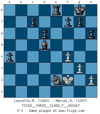 Last move : 0-1 2008 November 4 17:54:5 [Event "FICGS__CHESS__CLASS_F__000067"] [Site "FICGS"] [Date "2008.10.22"] [Round "1"] [White "Leurette,Marc-Antoine"] [Black "Marcel,Alexis"] [Result "0-1"] [WhiteElo "1360"] [BlackElo "1047"] 1.e4 e5 2.Nf3 Nf6 3.Nc3 Bb4 4.d4 exd4 5.Nxd4 Bxc3+ 6.Bd2 Bxd4 7.Bc3 Bxc3+ 8.bxc3 Nxe4 9.Bd3 Nc5 10.O-O Nxd3 11.Qe2+ Qe7 12.Qd2 Nc5 13.Rae1 Ne6 14.Re3 O-O 15.Rfe1 Qg5 16.Qe2 Nc6 17.Rg3 Qa5 18.Rh3 d6 19.Qd3 h6 20.Rg3 Qxa2 21.Qd1 Bd7 22.Qg4 Ncd8 23.Qe2 Nf4 24.Qe4 Nde6 25.Qxb7 Rab8 26.Qf3 Rb1 27.Qe3 Qxc2 28.Rf3 Rxe1+ 29.Qxe1 Bb5 30.c4 Bxc4 31.Rxf4 Nxf4 32.g3 Qe2 33.Qxe2 Nxe2+ 34.Kg2 Bd5+ 35.Kf1 Re8 36.f4 a5 37.Kf2 a4 0-1 Petrov Three knights game Kingside Castling by player White (move 10) Kingside Castling by player Black (move 14) Player Black won this chess game. Follow this game move after move (download)Everything is in a state of flux, and this includes the world of Chess. (Mikhail Botvinnik) Ich spiele 70 Eröffnungssysteme. (Viktor Kortschnoi) Una partida de Ajedrez se divide en 3 etapas: la primera cuando piensas que tienes la ventaja, la segunda cuando crees que tienes la ventaja y la tercera... ¡cuando te das cuenta que vas a perder!. (Savielly Tartakower) Tout change constamment, y compris dans le monde des Echecs. (Botvinnik) The general who wins the battle makes many calculations in his temple before the battle is fought. The general who loses makes but few calculations beforehand. (Sun Tzu)