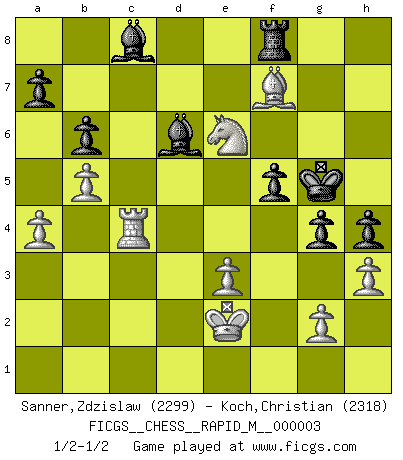 Last move : 1/2-1/2 2006 October 22 12:50:54 [Event "FICGS__CHESS__RAPID_M__000003"] [Site "FICGS"] [Date "2006.08.14"] [Round "1"] [White "Sanner,Zdzislaw"] [Black "Koch,Christian"] [Result "1/2-1/2"] [WhiteElo "2299"] [BlackElo "2318"] 1.d4 Nf6 2.Nf3 e6 3.e3 c5 4.Bd3 d5 5.c3 Nbd7 6.Nbd2 Be7 7.O-O O-O 8.e4 dxe4 9.Nxe4 cxd4 10.cxd4 Nxe4 11.Bxe4 Nf6 12.Bd3 b6 13.Ne5 Bb7 14.Re1 Qd5 15.Nf3 Rfd8 16.Bf4 Qh5 17.Ne5 Qxd1 18.Raxd1 Nd5 19.Be3 Rac8 20.a3 Nxe3 21.fxe3 f6 22.Nf3 g5 23.Kf2 g4 24.Ng1 Bd6 25.Ne2 h5 26.Rc1 Rxc1 27.Rxc1 h4 28.h3 f5 29.Bb5 Kf7 30.Bc6 Ba6 31.b4 e5 32.b5 Bc8 33.dxe5 Bxe5 34.Nf4 Kf6 35.Ke2 Kg5 36.Rc4 Rh8 37.Bd5 Bd6 38.a4 Re8 39.Bf7 Rf8 40.Ne6+ 1/2-1/2 Queen's pawn : Yusupov-Rubinstein system Kingside Castling by player White (move 7) Kingside Castling by player Black (move 7) This chess game ended in a draw. Follow this game move after move (download)Look at Garry Kasparov. After he loses, invariably he wins the next game. He just kills the next guy. That's something that we have to learn to be able to do. (Maurice Ashley) Besser ein falscher Plan, logisch durchgeführt, als gar kein Plan. (Viktor Kortschnoi) Dios mío, Bobby Fischer juega tan simple. (Alexei Suetin) Il (Jacob Murray) ne joue pas pour le bon coup, mais pour le meilleur. (Eloi Relange) To be champion requires more than simply being a strong player; one has to be a strong human being as well. (Anatoly Karpov)