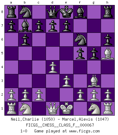 Last move : 1-0 2008 October 30 7:37:26 [Event "FICGS__CHESS__CLASS_F__000067"] [Site "FICGS"] [Date "2008.10.22"] [Round "1"] [White "Neil,Charlie"] [Black "Marcel,Alexis"] [Result "1-0"] [WhiteElo "1050"] [BlackElo "1047"] 1.d4 f5 2.Bg5 h6 3.Bh4 g5 4.e3 Nf6 5.Bg3 b6 6.Be2 Bb7 7.Bh5+ 1-0 Dutch, 2.Bg5 variation Player White won this chess game. Follow this game move after move (download)The Chess pieces are the block alphabet which shapes thoughts; and these thoughts, although making a visual design on the chessboard, express their beauty abstractly, like a poem. (Marcel Duchamp) In Buenos Aires ist es nicht mein vorrangiges Ziel ein starkes Turnier zu organisieren, sondern ein Turnier für Gentlemen. Ich würde nie Kamsky einladen. Ich mag keine Probleme. (Miguel Najdorf) La maestría del Ajedrez consiste esencialmente en analizar posiciónes de Ajedrez con precisión. (Mikhail Botvinnik) La tactique, c'est ce que vous faites quand il y a quelque chose à faire; la stratégie, c'est ce que vous faites quand il n'y a rien à faire. (Savielli Tartacower) If you are good, you will be assigned all the work. If you are really good, you will get out of it. (Dan Rotaru)