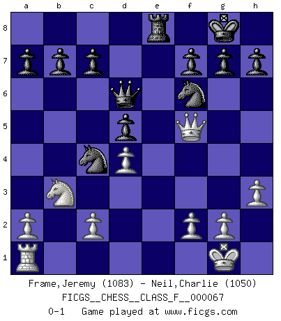 Last move : 0-1 2008 November 2 23:15:31 [Event "FICGS__CHESS__CLASS_F__000067"] [Site "FICGS"] [Date "2008.10.22"] [Round "1"] [White "Frame,Jeremy"] [Black "Neil,Charlie"] [Result "0-1"] [WhiteElo "1083"] [BlackElo "1050"] 1.e4 e6 2.d4 d5 3.exd5 exd5 4.Bf4 Nf6 5.Nd2 Bd6 6.Bxd6 Qxd6 7.Bd3 O-O 8.Ngf3 Bg4 9.O-O Nc6 10.h3 Bh5 11.Be2 Rfe8 12.Re1 Rad8 13.Ne5 Bxe2 14.Rxe2 Nxe5 15.Nb3 Nc4 16.Qd3 Nxb2 17.Rxe8+ Rxe8 18.Qf5 Nc4 0-1 French : Exchange variation Kingside Castling by player Black (move 7) Kingside Castling by player White (move 9) Player Black won this chess game. Follow this game move after move (download)Chess is thirty to forty percent psychology. You don't have this when you play a computer. I can't confuse it. (Judith Polgar) Das Schachspiel ist ein See, in welchem eine Mücke baden und ein Elefant ertrinken kann. (Emanuel Lasker) Bobby Fischer es el jugador de Ajedrez mas grande que jamás haya existido. (Ken Smith) Le pion, dans sa simplicité, marche droit devant lui, mais lorsqu'il prend, il le fait obliquement? Ainsi l'homme, tant qu'il reste pauvre, marche dans la droiture et vit honnêtement, mais lorsqu'il recherche les honneurs, il flatte, se parjure et, par les voies obliques, cherche une position supérieure sur l'échiquier du monde. (Jean de Galles) We're missing something. (Gregory House, House M.D.)