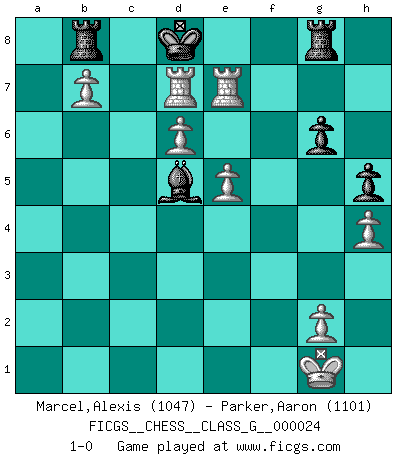 Last move : 1-0 2008 November 1 22:11:57 [Event "FICGS__CHESS__CLASS_G__000024"] [Site "FICGS"] [Date "2008.10.22"] [Round "1"] [White "Marcel,Alexis"] [Black "Parker,Aaron"] [Result "1-0"] [WhiteElo "1047"] [BlackElo "1101"] 1.f4 Nc6 2.Nf3 d5 3.e3 Qd6 4.Be2 Bd7 5.O-O O-O-O 6.b3 Qf6 7.Nc3 Qd6 8.Bb2 h6 9.Nb5 Qe6 10.Nfd4 Nxd4 11.Nxd4 Qb6 12.c4 dxc4 13.Bxc4 e6 14.Nf3 Nf6 15.Ne5 Be8 16.Bd4 Bc5 17.Bxc5 Qxc5 18.d4 Qe7 19.Qe2 Nd7 20.Ba6 Nxe5 21.Bxb7+ Kxb7 22.fxe5 Bc6 23.b4 Rb8 24.b5 Bd7 25.a4 Kc8 26.Rac1 Kd8 27.Qc4 Bc8 28.e4 Ke8 29.Qxc7 Qxc7 30.Rxc7 Ra8 31.R1xf7 Rg8 32.d5 h5 33.h4 exd5 34.exd5 Bg4 35.d6 Kd8 36.a5 g6 37.b6 axb6 38.axb6 Rb8 39.b7 Be6 40.Rfe7 Bd5 41.Rcd7+ 1-0 Bird's Opening Kingside Castling by player White (move 5) Queenside Castling by player Black (move 5) Player White won this chess game. Follow this game move after move (download)Tactics flow from a superior position. (Bobby Fischer) Irgendwie scheint mir sonntags früh um 9 Uhr der Killerinstinkt verloren gegangen zu sein. (Alexej Shirov) El Ajedrez es en su esencia, un juego. En su forma, un arte. Y en su ejecución, una ciencia. (Baron Tassilo) Même si l'adversaire joue le coup analysé précédemment, recommencez l'analyse en voyant la nouvelle position. Première règle de Blumenfeld The beginning of wisdom is silence. The second step is listening. (Unknown)