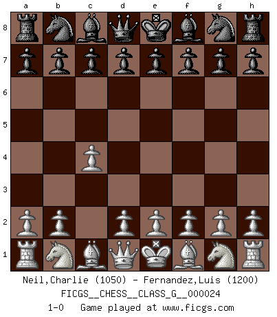 Last move : 1-0 2008 December 9 1:58:19 [Event "FICGS__CHESS__CLASS_G__000024"] [Site "FICGS"] [Date "2008.10.22"] [Round "1"] [White "Neil,Charlie"] [Black "Fernandez,Luis"] [Result "1-0"] [WhiteElo "1050"] [BlackElo "1200"] 1.c4 1-0 This chess game has been lost on time (started : 2008.10.22 17:45:43) English Opening Player White won this chess game. Follow this game move after move (download)Look at Garry Kasparov. After he loses, invariably he wins the next game. He just kills the next guy. That's something that we have to learn to be able to do. (Maurice Ashley) Über Karpov: Er war und ist ein Vertreter der russischen Reaktionäre. Das steckt tief in seiner Seele, wehalb ich nicht nett mit ihm umgehen kann. (Viktor Kortschnoi) Siempre es mucho mejor sacrificar las piezas de tu oponente. (Savielly Tartakover) Horreur, mais aussi harmonie suprême : qu'y avait-il en effet au monde en dehors des échecs ? Le brouillard, l'inconnu, le non-être... (Vladimir Nabokov) They say poker is a zero-sum game. It must be, because every time I play my sum ends up zero. (Max Shapiro)
