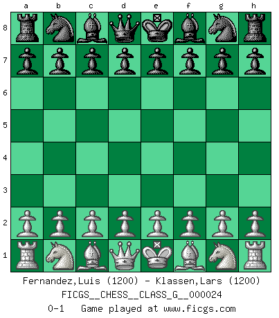 Last move : 0-1 2008 December 9 1:58:19 [Event "FICGS__CHESS__CLASS_G__000024"] [Site "FICGS"] [Date "2008.10.22"] [Round "1"] [White "Fernandez,Luis"] [Black "Klassen,Lars"] [Result "0-1"] [WhiteElo "1200"] [BlackElo "1200"] 0-1 This chess game has been lost on time (started : 2008.10.22 17:45:43) Player Black won this chess game. Follow this game move after move (download)Many Chess players were surprised when after the game, Fischer quietly explained: 'I had already analyzed this possibility' in a position which I thought was not possible to foresee from the opening. (Mikhail Tal) Es hat in meinem Leben Zeiten gegeben, in denen das Schachspiel, wenn nicht zum Lebenszweck, so doch zu einem regelrechten Lebensersatz geworden ist. Man fühlt sich in solchen Zeiten nicht so, als besäße man eine göttliche Gabe, sondern eher so, als sei man von ihr besessen. (Garry Kasparov) Cada Peón es potencialmente una Reina. (James Mason) Tout change constamment, y compris dans le monde des Echecs. (Botvinnik) There is no instance of a country having benefited from prolonged warfare. (Sun Tzu)