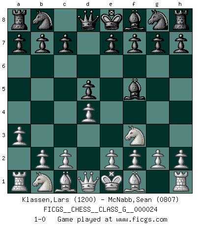 Last move : 1-0 2008 November 24 20:58:11 [Event "FICGS__CHESS__CLASS_G__000024"] [Site "FICGS"] [Date "2008.10.22"] [Round "1"] [White "Klassen,Lars"] [Black "McNabb,Sean"] [Result "1-0"] [WhiteElo "1200"] [BlackElo "0807"] 1.d4 d5 2.Nf3 Bf5 3.a3 1-0 Queen's pawn game Player White won this chess game. Follow this game move after move (download)Every Chess master was once a beginner. (Chernev) Den Ruhm habe ich schon, jetzt brauche ich noch das Geld. (Wilhelm Steinitz) Hasta este punto, las blancas han seguido un análisis bien conocido. Pero ahora el hace un error fatal: empieza a usar su propia cabeza. (Siegbert Tarrasch) Le thème de l'attaque double intervient d'une manière ou d'une autre dans l'immense majorité des combinaisons. (Youri Averbakh) Imagination is more important than knowledge. Knowledge is limited. Imagination encircles the world. (Albert Einstein)
