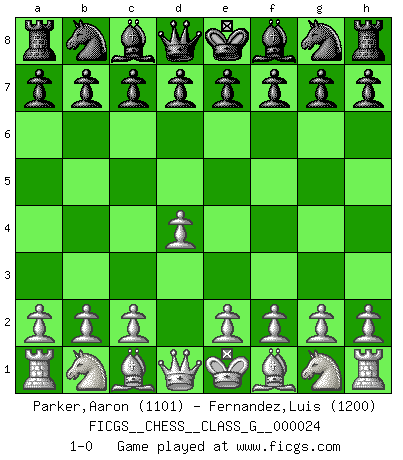 Last move : 1-0 2008 December 9 14:3:38 [Event "FICGS__CHESS__CLASS_G__000024"] [Site "FICGS"] [Date "2008.10.22"] [Round "1"] [White "Parker,Aaron"] [Black "Fernandez,Luis"] [Result "1-0"] [WhiteElo "1101"] [BlackElo "1200"] 1.d4 1-0 This chess game has been lost on time (started : 2008.10.22 17:45:43) Queen's pawn Player White won this chess game. Follow this game move after move (download)We must make sure that Chess will not be like a dead language, very interesting, but for a very small group. (Sytze Faber) Wie ich sie so einen nach dem anderen nieder mähte wurde meine Überlegenheit offensichtlich. (José Raúl Capablanca) El juego de Damas es para vagabundos. (Paul Morphy) D'abord les bases : Jouez et étudiez, puis étudiez et jouez, ensuite jouez et étudiez, puis étudiez et jouez. Deuxièmement : Donnez toujours le meilleur de vous-même ! (Ken Smith) The problem with troubleshooting is that trouble shoots back. (Anonymous)