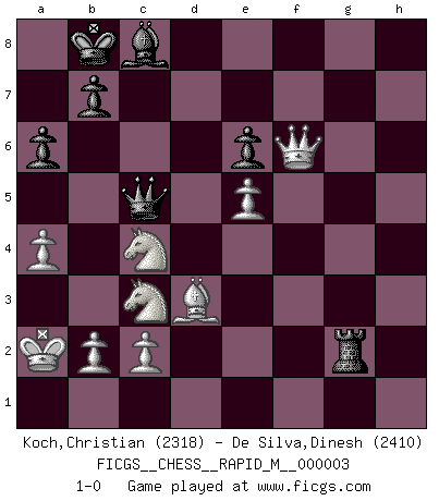 Last move : 1-0 2006 November 20 2:25:56 [Event "FICGS__CHESS__RAPID_M__000003"] [Site "FICGS"] [Date "2006.08.14"] [Round "1"] [White "Koch,Christian"] [Black "De Silva,Dinesh"] [Result "1-0"] [WhiteElo "2318"] [BlackElo "2410"] 1.e4 c5 2.Nf3 d6 3.d4 cxd4 4.Nxd4 Nf6 5.Nc3 e6 6.g4 h6 7.h4 Nc6 8.Rg1 h5 9.gxh5 Nxh5 10.Bg5 Nf6 11.Qd2 Qb6 12.Nb3 a6 13.Be2 Qc7 14.O-O-O Bd7 15.Kb1 Be7 16.Bf4 Ne5 17.Rxg7 Rxh4 18.Bg5 Rh8 19.f4 Nc6 20.Rg1 Qb6 21.Qe1 Rf8 22.f5 O-O-O 23.Rf1 Ne8 24.f6 Bxf6 25.Bxf6 Nxg7 26.Bxg7 Rg8 27.Bf6 Rde8 28.Qd1 Ne5 29.a4 Qc7 30.Bxe5 dxe5 31.Rxf7 Ref8 32.Rxf8+ Rxf8 33.Qg1 Rh8 34.Nd2 Kb8 35.Nc4 Rh4 36.Ka2 Rh8 37.Qg7 Rd8 38.Nxe5 Bc8 39.Qf6 Rd2 40.Bd3 Rg2 41.Nc4 Qc5 42.e5 1-0 This chess game has been lost on time (started : 2006.08.14 11:40:8) Sicilian : Scheveningen, Keres attack Queenside Castling by player White (move 14) Queenside Castling by player Black (move 22) Player White won this chess game. Follow this game move after move (download)All I want to do, ever, is just play Chess. (Bobby Fischer) Als er Schachweltmeister wurde ließ er praktisch alle stärksten Sovietspieler für sich arbeiten. Wenn ein auch nur mittelmässiger Meister ein Spezialist für eine bestimmte Eröffnung war, wurde er von Karpov gerufen. Das wurde alles geheim gehalten. (Mikhail Moiseyevich Botvinik) Cuando tu casa esta en llamas, no puedes ser molestado por tus vecinos. O, como decinos en Ajedrez, si tu Rey esta bajo ataque, no te preocupa perder un Peón del lado de la Reina. (Gary Kasparov) A chaque perte on perd un peu de soi. (Joël Lautier) I don't diet. I just don't eat as much as I'd like to. (Linda Evangelista, supermodel)