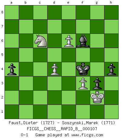 Last move : 0-1 2009 January 11 16:2:51 [Event "FICGS__CHESS__RAPID_B__000107"] [Site "FICGS"] [Date "2008.10.22"] [Round "1"] [White "Faust,Dieter"] [Black "Soszynski,Marek"] [Result "0-1"] [WhiteElo "1727"] [BlackElo "1771"] 1.d4 c6 2.c4 d5 3.Nf3 g6 4.Nc3 Nf6 5.cxd5 cxd5 6.Bf4 Bg7 7.e3 O-O 8.Qb3 Nc6 9.Bd3 Na5 10.Qa4 a6 11.O-O Nh5 12.Bg5 f6 13.Bh4 b5 14.Qb4 Be6 15.Rac1 Nc6 16.Qb3 Na5 17.Qc2 Qd7 18.h3 Rac8 19.a3 Bxh3 20.gxh3 Qxh3 21.Qe2 e5 22.Nxd5 e4 23.Bxe4 Qg4+ 24.Kh2 Qxe4 25.Nc3 Qe6 26.Nd2 Nc4 27.Nxc4 Rxc4 28.Qf3 Rfc8 29.Rg1 f5 30.Rcd1 Nf6 31.Bxf6 Bxf6 32.Kg2 Kg7 33.Rh1 h5 34.Rdg1 h4 35.Kf1 Bd8 36.Qb7+ Be7 37.Rh3 b4 38.axb4 Rxb4 39.Qd5 Qf6 40.Rgh1 g5 41.Rf3 Rf8 42.Ne4 Qf7 43.Qe5+ Kg6 44.Nc3 Rxb2 45.e4 f4 46.Nd5 Bd8 47.Qd6+ Kg7 48.Rg1 Qg6 49.Qxg6+ Kxg6 50.Rxf4 Rxf4 51.Nxf4+ Kh6 52.Nd5 Rb1+ 53.Kg2 Rxg1+ 54.Kxg1 a5 55.Nc3 g4 56.f3 Bb6 57.Nb5 g3 58.Kg2 Kg5 59.e5 Kf4 60.e6 Bd8 61.Na7 a4 62.Nc6 Bf6 0-1 Queen's pawn Kingside Castling by player Black (move 7) Kingside Castling by player White (move 11) 10 pieces endgame at move 54 : White KNPPP , Black KBPPP WHITE : King + 1 Knight 3 Pawns BLACK : King + 1 Bishop 3 Pawns Player Black won this chess game. Follow this game move after move (download)Without error there can be no brilliancy. (Emanuel Lasker) Es gibt nur zwei wahre Schachgenies - das andere war Wilhelm Steinitz, der Weltmeister von 1872 bis 1894. (Robert James Fischer) El ganar no lo es todo... pero el perder es nada. (Mednis) C'est une question de caractère, Beaucoup de gens perdent leur motivation très vite. D'autres, ils sont rares, peuvent la conserver très longtemps. J'aime les échecs, encore aujourd'hui je suis heureux d'analyser des parties. J'aime toujours gagner, je déteste encore perdre. Bien jouer est important pour mon intégrité intellectuelle et morale. Et puis les échecs vivent en ce moment une période historique grâce à Internet. Ils se développent dans les systèmes éducatifs à travers le monde. Ils sortent de leur ghetto, et c'est mon rôle de mener à bien cette révolution. (Gary Kasparov) Fame, I have already. Now I need the money. (an elderly Steinitz)
