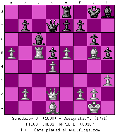 Last move : 1-0 2008 November 17 15:3:46 [Event "FICGS__CHESS__RAPID_B__000107"] [Site "FICGS"] [Date "2008.10.22"] [Round "1"] [White "Suhodolov,Dmitry"] [Black "Soszynski,Marek"] [Result "1-0"] [WhiteElo "1800"] [BlackElo "1771"] 1.d4 c6 2.e4 d5 3.e5 g6 4.c4 Bg7 5.Nc3 Nh6 6.Bf4 dxc4 7.Bxc4 Nd7 8.Qd2 Nb6 9.Bb3 Nf5 10.Nf3 h5 11.O-O a5 12.a4 Nd5 13.Nxd5 cxd5 14.Rfc1 O-O 15.h3 Bh8 16.Rc3 Be6 17.Rac1 Ra6 18.Rc7 Rb6 19.Bd1 Bd7 20.R7c5 Rc6 21.Rxc6 Bxc6 22.Rc5 Ng7 23.Rxa5 Ne6 24.Be3 Re8 25.Ng5 Nxg5 26.Bxg5 Qc7 27.Rc5 Qd7 28.a5 1-0 Queen's pawn Kingside Castling by player White (move 11) Kingside Castling by player Black (move 14) Player White won this chess game. Follow this game move after move (download)Fischer sacrificed virtually everything most of us weakies (to use his term) value, respect, and cherish, for the sake of an artful, often beautiful board game, for the ambivalent privilege of being its greatest master. (Paul Kollar) Der Bart als Geschlechtszeichen mitten im Gesicht ist obszön. Daher gefällt er den Weibern. [Zugegeben, kein Schachzitat, aber unglaublich originell] (Arthur Schopenhauer) Nos gusta pensar. (Gary Kasparov) Les échecs sont utiles à l'exercice de la faculté de penser et à celle de l'imagination. Car nous devons posséder une méthode élaborée pour atteindre des buts partout où nous devons conduire notre raison. (Leibnitz) It is not true that people stop pursuing dreams because they grow old, they grow old because they stop pursuing dreams. (Gabriel Garcia Marquez)