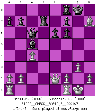 Last move : 1/2-1/2 2008 November 19 18:0:12 [Event "FICGS__CHESS__RAPID_B__000107"] [Site "FICGS"] [Date "2008.10.22"] [Round "1"] [White "Berti,Massimiliano"] [Black "Suhodolov,Dmitry"] [Result "1/2-1/2"] [WhiteElo "1800"] [BlackElo "1800"] 1.d4 d5 2.c4 c6 3.Nc3 Nf6 4.e3 e6 5.Nf3 Nbd7 6.Qc2 Bd6 7.e4 dxe4 8.Nxe4 Nxe4 9.Qxe4 Nf6 10.Qc2 c5 11.dxc5 Bxc5 12.Bd3 Qc7 13.O-O Bd7 14.Qe2 Bc6 15.Ne5 Rd8 16.Bf4 Rd4 17.g3 O-O 18.Nxc6 Qxc6 19.Be5 Rd7 20.Bxf6 gxf6 21.Bxh7+ 1/2-1/2 QGD Slav defense Kingside Castling by player White (move 13) Kingside Castling by player Black (move 17) This chess game ended in a draw. Follow this game move after move (download)He who fears an isolated Queen's Pawn should give up Chess. (Siegbert Tarrasch) Wie, soll nun auch die Opposition abgeschafft werden? Ja, es tut mir leid, Ihnen diesen Schmerz nicht ersparen zu können. (Aaron Nimzowitsch) El Ajedrez es un cuento de Hadas de las 1001 metidas de pata. (Savielly Tartakower) La solitude du joueur d'Echecs à l'approche du mat est semblable à celle du condamné. (Francis Szpiner) Wawaweewa ! (Borat: Cultural learnings of America for make benefit glorious nation of Kazakhstan)