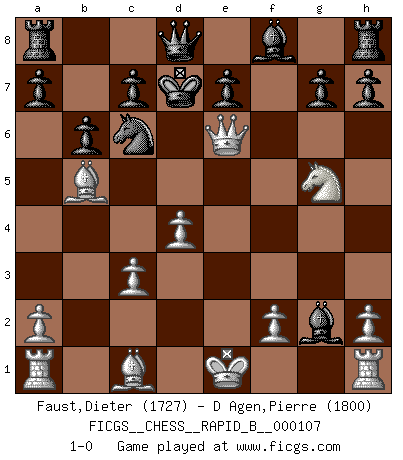 Last move : 1-0 2008 November 28 14:35:58 [Event "FICGS__CHESS__RAPID_B__000107"] [Site "FICGS"] [Date "2008.10.22"] [Round "1"] [White "Faust,Dieter"] [Black "D Agen,Pierre"] [Result "1-0"] [WhiteElo "1727"] [BlackElo "1800"] 1.d4 d5 2.c4 Nc6 3.Nf3 Nf6 4.Nc3 Bf5 5.cxd5 Nxd5 6.Qb3 Nxc3 7.bxc3 b6 8.e4 Bg6 9.Bb5 Bxe4 10.Ng5 Bxg2 11.Qxf7+ Kd7 12.Qe6+ 1-0 QGD : Chigorin defense Player White won this chess game. Follow this game move after move (download)An attack on the wing should be met by play in the center. (Nimzovitch) Ivan Sokolov treibt mich als Beifahrer an mit go Loeky go - . (Loek van Wely) Un entendimiento minucioso de las típicas continuaciones de mate hacen de las mas complicadas combinaciones de sacrificio que conducen hacia ellas no solo no dificiles, sino casi un asunto de rutina. (Siegbert Tarrasch) Les Echecs sont et restent toujours un combat, un combat intégral comme la boxe, la lutte ou un autre sport, et où il doit y avoir un vainqueur et un vaincu. (Joseph Emil Diemer) Success without honor is an unseasoned dish; it will satisfy your hunger, but it won't taste good. (Joe Paterno)