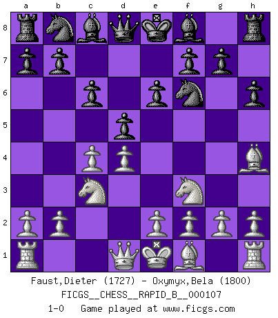 Last move : 1-0 2008 December 6 10:51:44 [Event "FICGS__CHESS__RAPID_B__000107"] [Site "FICGS"] [Date "2008.10.22"] [Round "1"] [White "Faust,Dieter"] [Black "Oxymyx,Bela"] [Result "1-0"] [WhiteElo "1727"] [BlackElo "1800"] 1.d4 d5 2.c4 c6 3.Nf3 Nf6 4.Nc3 e6 5.Bg5 h6 6.Bh4 1-0 This chess game has been lost on time (started : 2008.10.22 17:47:10) QGD Slav : 4.Nc3 Player White won this chess game. Follow this game move after move (download)Chess is a forcing house where the fruits of character can ripen more fully than in life. (Edward Morgan Foster) Ein Schachgenie ist jemand der verdammt gut Schach spielt. (Jonathan Levitt) Todo lo que importa ante el tablero de Ajedrez son buenas jugadas. (Bobby Fischer) Le pion, dans sa simplicité, marche droit devant lui, mais lorsqu'il prend, il le fait obliquement? Ainsi l'homme, tant qu'il reste pauvre, marche dans la droiture et vit honnêtement, mais lorsqu'il recherche les honneurs, il flatte, se parjure et, par les voies obliques, cherche une position supérieure sur l'échiquier du monde. (Jean de Galles) The difference between perseverance and obstinacy is that one comes from a strong will, and the other from a strong won't. (Henry Ward Beecher)
