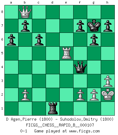 Last move : 0-1 2008 November 7 9:53:21 [Event "FICGS__CHESS__RAPID_B__000107"] [Site "FICGS"] [Date "2008.10.22"] [Round "1"] [White "D Agen,Pierre"] [Black "Suhodolov,Dmitry"] [Result "0-1"] [WhiteElo "1800"] [BlackElo "1800"] 1.d4 d5 2.c4 c6 3.Nf3 Nf6 4.Nc3 a6 5.a4 e6 6.Bg5 Nbd7 7.e4 dxe4 8.Nxe4 Bb4+ 9.Nc3 Qa5 10.Bd2 O-O 11.Bd3 e5 12.O-O exd4 13.Nxd4 Ne5 14.Be2 Rd8 15.Nf3 Nfg4 16.Nxe5 Nxe5 17.Qc2 Bf5 18.Qc1 Nd3 19.Bxd3 Bxd3 20.Rd1 Bxc4 21.Ne4 Bd5 22.Bxb4 Qxb4 23.Nc3 Bb3 24.Rxd8+ Rxd8 25.Qe3 Bxa4 26.Nxa4 Qxa4 27.Re1 Qb4 28.h3 g6 29.Qe7 Rd4 30.Qe5 Rd5 31.Qb8+ Kg7 32.Re5 Rd1+ 33.Kh2 Qf4+ 0-1 QGD Slav : 4.Nc3 Kingside Castling by player Black (move 10) Kingside Castling by player White (move 12) Player Black won this chess game. Follow this game move after move (download)In Chess, at least, the brave inherit the earth. (Edmar Mednis) Man gibt nur Pakete auf. (Paul Keres) Una buena ofensiva y una buena defensa, comienzan ambas con un buen desarrollo. (Bruce A. Moon) Ce qui caractérise les parties de combat, c'est que si le défenseur a constamment de difficiles problèmes à résoudre, l'attaquant doit chercher sans relâche de nouvelles possibilités d'attaque. (Koblentz) Industry executives and analysts often mistakenly talk about strategy as if it were some kind of chess match. But in chess, you have just two opponents, each with identical resources, and with luck playing a minimal role. The real world is much more like a poker game, with multiple players trying to make the best of whatever hand fortune has dealt them. In our industry, Bill Gates owns the table until someone proves otherwise. (David Moschella, 'Computerworld')