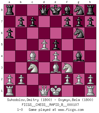 Last move : 1-0 2008 December 8 13:55:42 [Event "FICGS__CHESS__RAPID_B__000107"] [Site "FICGS"] [Date "2008.10.22"] [Round "1"] [White "Suhodolov,Dmitry"] [Black "Oxymyx,Bela"] [Result "1-0"] [WhiteElo "1800"] [BlackElo "1800"] 1.d4 d5 2.c4 dxc4 3.e4 Nc6 4.Nf3 Bg4 5.d5 Ne5 6.Bf4 Ng6 7.Be3 e5 8.Bxc4 a6 9.Nc3 1-0 This chess game has been lost on time (started : 2008.10.22 17:47:10) QGA : 3.e4 Player White won this chess game. Follow this game move after move (download)It's always better to sacrifice your opponent's men. (Savielly Tartakover) Der Vorposten provoziert a) eine Basis für neue Angriffe und b) eine Schwächung der gegnerischen Widerstandskraft in der fraglichen Linie. (Aaron Nimzowitsch) Todos los jugadores de Ajedrez deberían tener un pasatiempo. (Savielly Tartakower) Je ne crois pas en la psychologie, je crois aux bons coups. (Robert Fischer) I just play for fun. (Anna Kournikova)