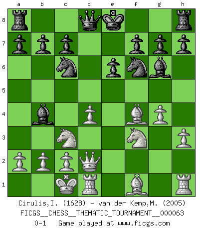 Last move : 0-1 2008 November 12 19:37:39 [Event "FICGS__CHESS__THEMATIC_TOURNAMENT__000063"] [Site "FICGS"] [Date "2008.10.23"] [Round "1"] [White "Cirulis,Ilmars"] [Black "van der Kemp,Michel"] [Result "0-1"] [WhiteElo "1628"] [BlackElo "2005"] 1.d4 d5 2.e4 dxe4 3.Nc3 Nf6 4.f3 exf3 5.Nxf3 Bg4 6.h3 Bh5 7.Bf4 e6 8.Qd2 Nc6 9.g4 Bg6 10.O-O-O Bb4 0-1 Blackmar gambit Queenside Castling by player White (move 10) Player Black won this chess game. Follow this game move after move (download)You are for me the Queen on d8 and I am the Pawn on d7 !! (Eduard Gufeld) Kombinieren und Schwarzhandel gehören verboten. (Savielly Grigorievitsch Tartakower) ¡Examina movidas que hagan daño! Un buen ojo for movidas desvastantes es mucho mas importante que el conocimiento de principios estratégicos. (Purdy) Un millionnaire : 'Monsieur Steinitz ! Vous ne participez aux tournois que pour l'argent, alors que moi je n'y viens que pour l'honneur.' Steinitz : 'Chacun joue pour ce qu'il n'a pas'... Unless I accept my faults I will most certainly doubt my virtues. (Hugh Prather)