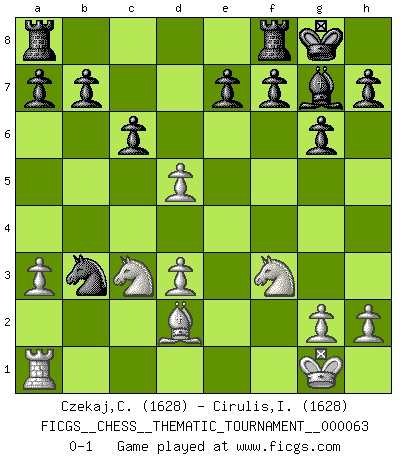 Last move : 0-1 2008 December 2 15:35:47 [Event "FICGS__CHESS__THEMATIC_TOURNAMENT__000063"] [Site "FICGS"] [Date "2008.10.23"] [Round "1"] [White "Czekaj,Christophe"] [Black "Cirulis,Ilmars"] [Result "0-1"] [WhiteElo "1628"] [BlackElo "1628"] 1.d4 d5 2.e4 dxe4 3.Nc3 Nf6 4.f3 exf3 5.Nxf3 g6 6.Bc4 Bg7 7.O-O O-O 8.Bg5 Nc6 9.d5 Na5 10.Be2 c6 11.b4 Qb6+ 12.Kh1 Qxb4 13.Qd3 Ng4 14.Bd2 Bf5 15.a3 Qb2 16.Rfb1 Qxa1 17.Rxa1 Nf2+ 18.Kg1 Nxd3 19.Bxd3 Bxd3 20.cxd3 Nb3 0-1 Blackmar gambit Kingside Castling by player White (move 7) Kingside Castling by player Black (move 7) Player Black won this chess game. Follow this game move after move (download)The hallmark of the artist is simplicity. (Larry Evans) Ein Gewinn durch eine ungenaue Kombination, sei sie auch noch so vorzeigbar, erfüllt mich mit Schaudern. (Wilhelm Steinitz) No hay otro maestro que tenga una voluntad terrífica de ganar. Al tablero, el irradía peligro y aún los oponentes mas fuertes tienden a congelarse como liebres cuando olfatean a una pantera. Aún sus debilidades son peligrosas. Con las blancas, su juego de apertura es predecible - te es posible hacer planes en su contra - pero es tan fuerte que tus planes casi nunca funcionan. En el juego medio, su precisión e invención son fabulosas y en finales, tú simplemente no le puedes vencer. (Experto Alemán anónimo) La vérité est comme le meilleur coup aux échecs : elle existe, mais il faut la chercher. (Arturo Perez-Reverte) Strategy without tactics is the slowest route to victory. Tactics without strategy is the noise before defeat. (Sun Tzu)