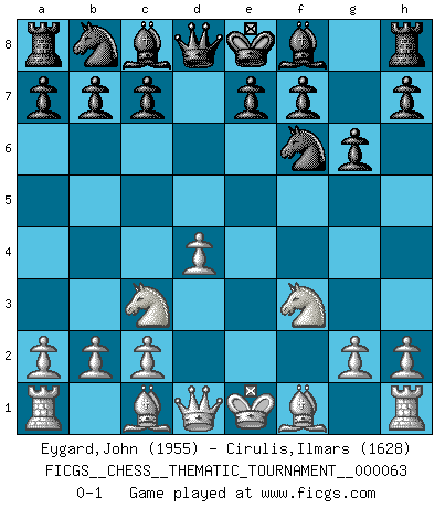 Last move : 0-1 2008 December 14 14:35:39 [Event "FICGS__CHESS__THEMATIC_TOURNAMENT__000063"] [Site "FICGS"] [Date "2008.10.23"] [Round "1"] [White "Eygard,John"] [Black "Cirulis,Ilmars"] [Result "0-1"] [WhiteElo "1955"] [BlackElo "1628"] 1.d4 d5 2.e4 dxe4 3.Nc3 Nf6 4.f3 exf3 5.Nxf3 g6 0-1 This chess game has been lost on time (started : 2008.10.23 6:11:44) Blackmar gambit Player Black won this chess game. Follow this game move after move (download)The older I grow, the more I value Pawns. (Keres) Wenn ich einen Club besuche, sind die Spieler stumm vor Staunen. (José Raúl Capablanca) Nos gusta pensar. (Gary Kasparov) Le joueur d'Echecs qui veut atteindre le top est obligé de développer son propre credo créatif. Alexeï Stepanovicth Souétine. Il est facile d'écrire des livres ! Ce qui est difficile, c'est de jouer ! (Alexeï Stepanovicth Souétine) SEO proverb : Make your website optimized for human beings, not for search engines.