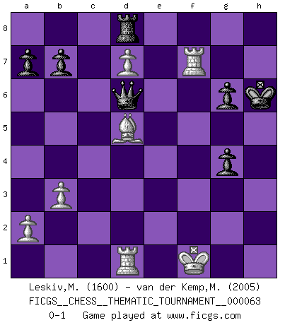 Last move : 0-1 2009 August 1 4:22:50 [Event "FICGS__CHESS__THEMATIC_TOURNAMENT__000063"] [Site "FICGS"] [Date "2008.10.23"] [Round "1"] [White "Leskiv,Miroslav"] [Black "van der Kemp,Michel"] [Result "0-1"] [WhiteElo "1600"] [BlackElo "2005"] 1.d4 d5 2.e4 dxe4 3.Nc3 Nf6 4.f3 exf3 5.Nxf3 Bg4 6.h3 Bh5 7.g4 Bg6 8.Ne5 e6 9.Bg2 c6 10.O-O Bd6 11.Qe2 Nbd7 12.h4 Bc7 13.Rd1 Nxe5 14.dxe5 Bb6+ 15.Kf1 Nd5 16.h5 O-O 17.Nxd5 cxd5 18.hxg6 fxg6 19.Bf3 h5 20.Kg2 hxg4 21.Bxg4 Rf2+ 22.Qxf2 Bxf2 23.Bxe6+ Kh7 24.c4 Bh4 25.Be3 Qe8 26.cxd5 Qb5 27.Rd2 Qb4 28.Kg1 Qe4 29.Bd4 Bg3 30.Rad1 g5 31.Rg2 Bf4 32.d6 Be3+ 33.Bxe3 Qxe3+ 34.Rf2 Qxe5 35.Bh3 Qg3+ 36.Bg2 Rd8 37.d7 g4 38.Kf1 Qc7 39.Rfd2 g6 40.b3 Qf4+ 41.Rf2 Qe5 42.Rf7+ Kh6 43.Bd5 Qd6 0-1 Blackmar gambit Kingside Castling by player White (move 10) Kingside Castling by player Black (move 16) Player Black won this chess game. Follow this game move after move (download)Fischer prefers to enter Chess history alone. (Miguel Najdorf) Sicherlich können nur Meister einen Stil haben. Daß ein nicht-Meister auch nur ein einziges Mal in seinem Leben eine Partie folgerecht durchführte, habe ich niemals bemerkt. (Emanuel Lasker) Los problemas de Ajedrez exigen del compositor las mismas virtudes que caracterizan todo el arte de valor: originalidad, invención, concisión, armonía, complejidad e insinceridad explendida. (Vladimir Nabokov) Une platitude souvent récitée à propos des Echecs est qu'une des choses les plus difficiles à réaliser est de gagner une position gagnante. Cela ne manque pas de sens mais, pour ma part, j'ai toujours trouvé plus difficile de gagner une position perdante. (Tim Krabbe) I feel so... helpless. (C-3PO in Star Wars ep.3)
