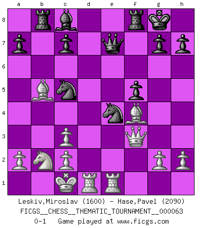 Last move : 0-1 2009 February 7 14:46:44 [Event "FICGS__CHESS__THEMATIC_TOURNAMENT__000063"] [Site "FICGS"] [Date "2008.10.23"] [Round "1"] [White "Leskiv,Miroslav"] [Black "Hase,Pavel"] [Result "0-1"] [WhiteElo "1600"] [BlackElo "2090"] 1.d4 d5 2.e4 dxe4 3.Nc3 Nf6 4.f3 exf3 5.Qxf3 Qxd4 6.Be3 Qg4 7.Qf2 e5 8.Nf3 Bb4 9.Nxe5 Qe4 10.Nc4 Qe7 11.O-O-O Bxc3 12.bxc3 Ne4 13.Qf3 O-O 14.Bf4 f5 15.Bd3 b5 16.Nb2 Na6 17.Rhe1 Nac5 18.Bxb5 Rb8 0-1 Blackmar gambit Queenside Castling by player White (move 11) Kingside Castling by player Black (move 13) Player Black won this chess game. Follow this game move after move (download)Chess is thirty to forty percent psychology. You don't have this when you play a computer. I can't confuse it. (Judith Polgar) Spielt Blackmar-Diemer-Gambit, und das Matt kommt von selbst! (Emil Joseph Diemer) Observen a Garry Kasparov. Después de una derrota, invariablemente el gana la próxima partida. Prácticamente hace pedazos a su siguiente oponente. Eso es algo que tenemos que aprender a lograr. (Maurice Ashley) Pour moi, les échecs ne sont pas un jeu mais un art. (Alexandre Alekhine) A married woman is like a fish riding a bicycle. (Rodolfo d'Ettorre)
