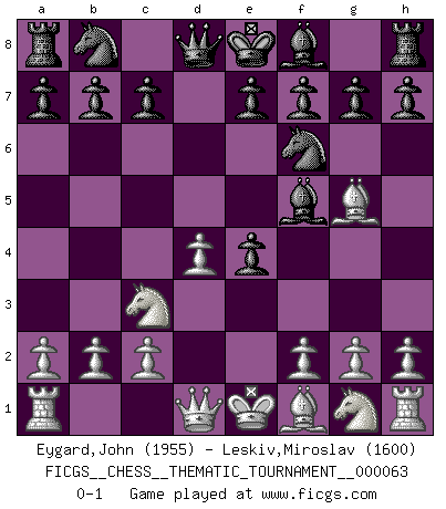 Last move : 0-1 2008 December 19 2:58:43 [Event "FICGS__CHESS__THEMATIC_TOURNAMENT__000063"] [Site "FICGS"] [Date "2008.10.23"] [Round "1"] [White "Eygard,John"] [Black "Leskiv,Miroslav"] [Result "0-1"] [WhiteElo "1955"] [BlackElo "1600"] 1.d4 d5 2.e4 dxe4 3.Nc3 Nf6 4.Bg5 Bf5 0-1 This chess game has been lost on time (started : 2008.10.23 6:11:44) Blackmar gambit Player Black won this chess game. Follow this game move after move (download)Your body has to be in top condition. Your Chess deteriorates as your body does. You can't separate body from mind. (Bobby Fischer) Verschiedene, sehr schätzbare und im Laufe des Lebens nützliche Eigenschaften des Geistes können durch das Schachspiel erworben und gekräftigt werden, so dass sie zu Gewohnheiten werden, die uns nie im Stich lassen. (Benjamin Franklin) Nos gusta pensar. (Gary Kasparov) On n'a jamais que l'âge auquel on a commence à jouer aux échecs car après on cesse de vieillir. (Capablanca) Good luck. You're gonna need it. (Han Solo in Star Wars ep.6)