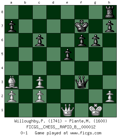 Last move : 0-1 2006 August 22 16:5:20 [Event "FICGS__CHESS__RAPID_B__000012"] [Site "FICGS"] [Date "2006.08.16"] [Round "1"] [White "Willoughby,Peter"] [Black "Plante,Marc-Eric"] [Result "0-1"] [WhiteElo "1741"] [BlackElo "1600"] 1.e4 c5 2.Nf3 d6 3.Bb5+ Bd7 4.Bxd7+ Qxd7 5.O-O Nc6 6.d4 cxd4 7.Nxd4 Nf6 8.Nc3 g6 9.Bg5 Bg7 10.Nxc6 bxc6 11.Qd3 Ng4 12.f3 Ne5 13.Qd1 Nc4 14.Rb1 Rb8 15.Qc1 Bxc3 16.bxc3 Rxb1 17.Qxb1 f6 18.Bc1 Kf7 19.Qb3 d5 20.Ba3 Nd2 21.Qb2 Nxf1 22.Kxf1 dxe4 23.Qc1 exf3 24.gxf3 Qh3+ 25.Kg1 Qxf3 26.Qe1 e5 0-1 Sicilian : Canal-Sokolsky attack, 3...Bd7 Kingside Castling by player White (move 5) Player Black won this chess game. Follow this game move after move (download)I had a toothache during the first game. In the second game I had a headache. In the third game it was an attack of rheumatism. In the fourth game, I wasn't feeling well. And in the fifth game? Well, must one have to win every game ? (Siegbert Tarrasch) Ein Schachgenie ist jemand der verdammt gut Schach spielt. (Jonathan Levitt) ¿Se han dado cuenta de que Fischer casi nunca ha tenido piezas malas? El las intercambia y las piezas malas se quedan con sus oponenets. (Yuri Balashov) Le plus grand jeu de l'esprit jamais inventé, plus vous l'apprenez, plus vous y prenez du plaisir. (Garry Kasparov) Fame, I have already. Now I need the money. (an elderly Steinitz)