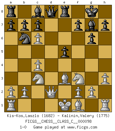 Last move : 1-0 2008 December 2 7:7:41 [Event "FICGS__CHESS__CLASS_C__000098"] [Site "FICGS"] [Date "2008.10.24"] [Round "1"] [White "Kis-Kos,Laszlo"] [Black "Kalinin,Valery"] [Result "1-0"] [WhiteElo "1682"] [BlackElo "1775"] 1.e4 d5 2.exd5 Nf6 3.d4 Nxd5 4.c4 Nb6 5.Nf3 g6 6.Nc3 Bg7 7.h3 O-O 8.Be3 Nc6 9.Qd2 e5 10.d5 Re8 11.dxc6 1-0 Scandinavian : Marshall variation Kingside Castling by player Black (move 7) Player White won this chess game. Follow this game move after move (download)Chess holds its master in its own bonds, shackling the mind and brain so that the inner freedom of the very strongest must suffer. (Albert Einstein) Rubinstein ist ein Turmendspiel, welches die Götter vor tausenden von Jahren begannen. (Savielly Grigorievitsch Tartakower) Debemos de asegurarnos de que el Ajedrez no se convierta en un lenguaje muerto, muy interesante, pero solo para un grupo muy pequeño. (Sytze Faber) A ce moment-là, je menaçais de comprendre la position ! (Clément L'Heureux) Who needs drugs and alcohol if he can play Big Chess at FICGS ? (Heinz-Georg Lehnhoff)