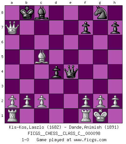 Last move : 1-0 2008 December 22 1:44:46 [Event "FICGS__CHESS__CLASS_C__000098"] [Site "FICGS"] [Date "2008.10.24"] [Round "1"] [White "Kis-Kos,Laszlo"] [Black "Dande,Animish"] [Result "1-0"] [WhiteElo "1682"] [BlackElo "1891"] 1.e4 c5 2.Nf3 Nc6 3.d4 cxd4 4.Nxd4 a6 5.Nc3 e6 6.Nxc6 bxc6 7.Be2 d5 8.O-O Bd6 9.Qd4 e5 10.Qa4 Bd7 11.exd5 cxd5 12.Qb3 d4 13.Ne4 Be7 14.Qg3 Qc7 15.Qxg7 O-O-O 16.Bxa6+ Kb8 17.Qxh8 Qc6 18.Qxe5+ Ka7 19.Bd3 Bc8 20.Qa5+ Kb8 21.Bf4+ Bd6 22.Nxd6 Rxd6 23.Be4 Qxe4 24.Bxd6+ Kb7 25.Qb5+ Ka7 26.Bc5+ Ka8 27.Qa5+ Kb8 28.Qa7+ 1-0 Sicilian defense Kingside Castling by player White (move 8) Queenside Castling by player Black (move 15) Player White won this chess game. Follow this game move after move (download)You can only get good at Chess if you love the game. (Bobby Fischer) Als ich elf wurde, wurde ich einfach gut. (Robert James Fischer) El Ajedrez es imaginación. (David Bronstein) Même si vous avez un bon coup à faire, regardez toujours s'il n'y en a pas un qui lui soit préférable. (Pedro Damiano) . 'gn is not allowed in chess unless n is an integer between 1 and 8 inclusive, where 1 and 8 are to interpreted as the standard numerals standing for integers in the ordered real-closed field R, with the *canonical* ordering. (As opposed to, say, an integer in the domain Z[2+i*sqrt(5)] or an integer in some exotic Grothendieck topos). (Normajean Yates)